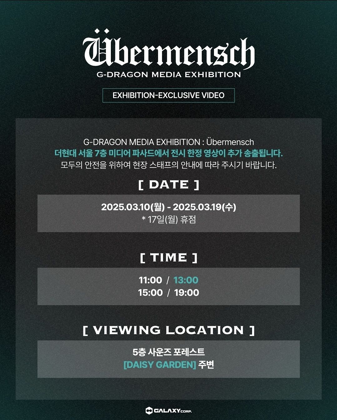 가수 G-DRAGON(지드래곤)이 3월 9일부터 서울 여의도 더현대 서울에서 특별한 미디어 전시회 <위버맨쉬>를 3월 19일까지 진행중입니다.