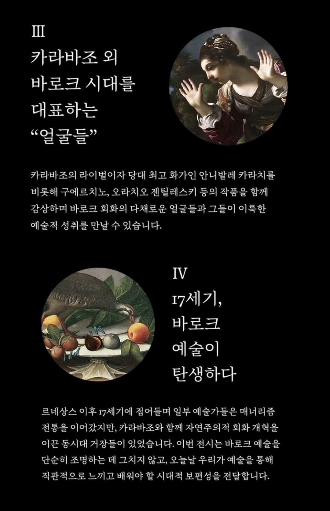 카라바조의 라이벌이자 당대 최고 화가인 안니발레 카라치를 비롯해 구에르치노, 오라치오 젠틸레스키릐 작품을 함께 감상하며 바로크 회화의 다채로운 얼굴들과 그들이 이룩한 예술적 성취를 만날 수 있다고 하네요.
