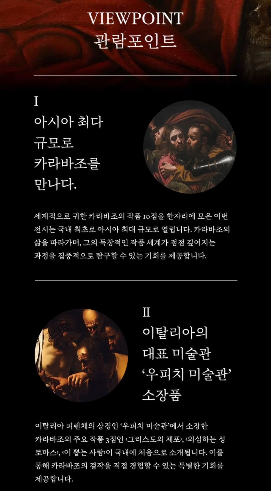 2024년 한·이 수교 140주년을 기념하여 기획된 이번 전시는 레오나르도 다빈치, 미켈란젤로와 더불어 3대 천재화가로 불리는 '카라바조'의 작품 10점을 포함한 바로크 시대를 대표하는 동시대 작가들의 작품 총 57점을 국내 최초 아시아 최대 규모로 선보입니다.
