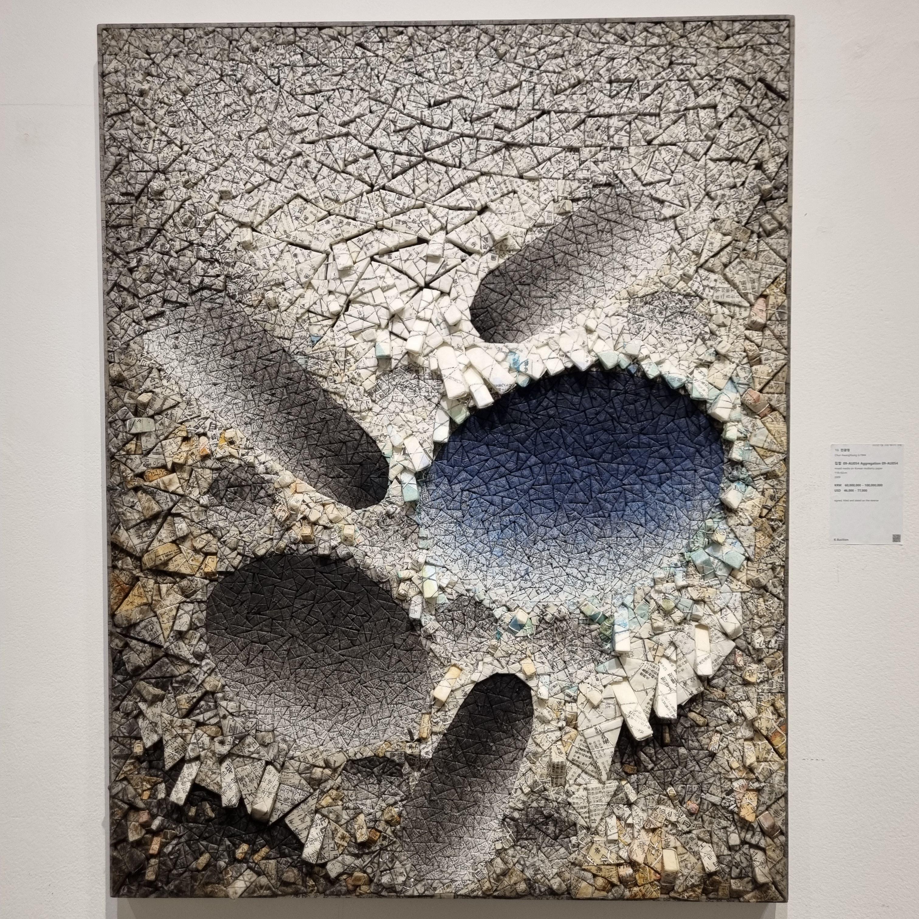 삼각기둥을 옛날 고서로 감싸고 매듭을 묶은 후 작은 조각들을 일정한 패턴으로 배열해 입체 회화를 만드신 전광영화백의 작품은 정말 빨려들어갈 것만 같은 임팩트가 있어요.