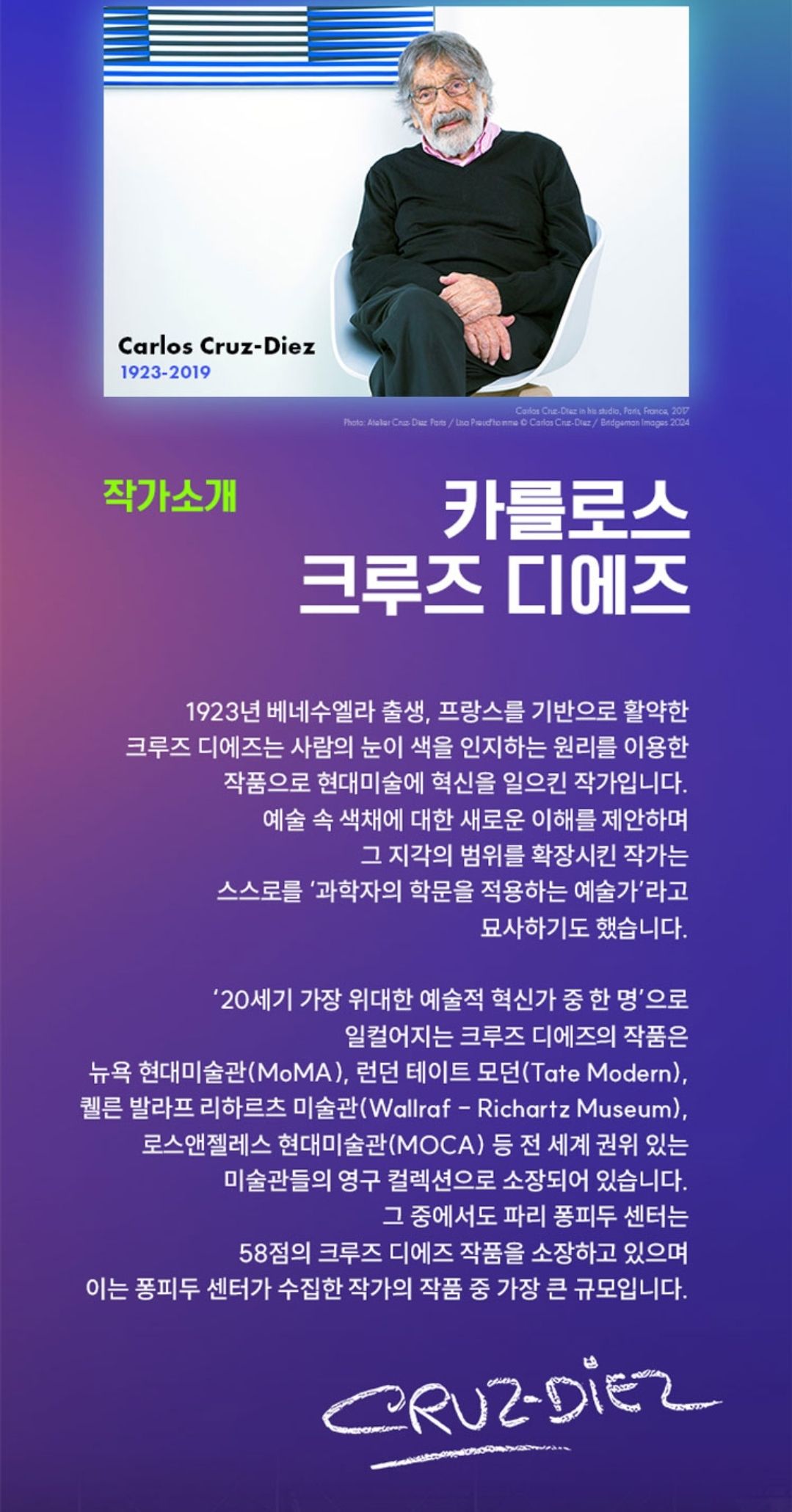 크루즈 디에즈의 탄생 100주년을 기념하며 열리는 이번 전시는 퐁피두센터와 크루즈 디에즈 재단의 협력으로 진행되고 있는 <RGB, THE COLOR OF THE CENTURY> 글로벌 전시 프로젝트의 한국 전시입니다.