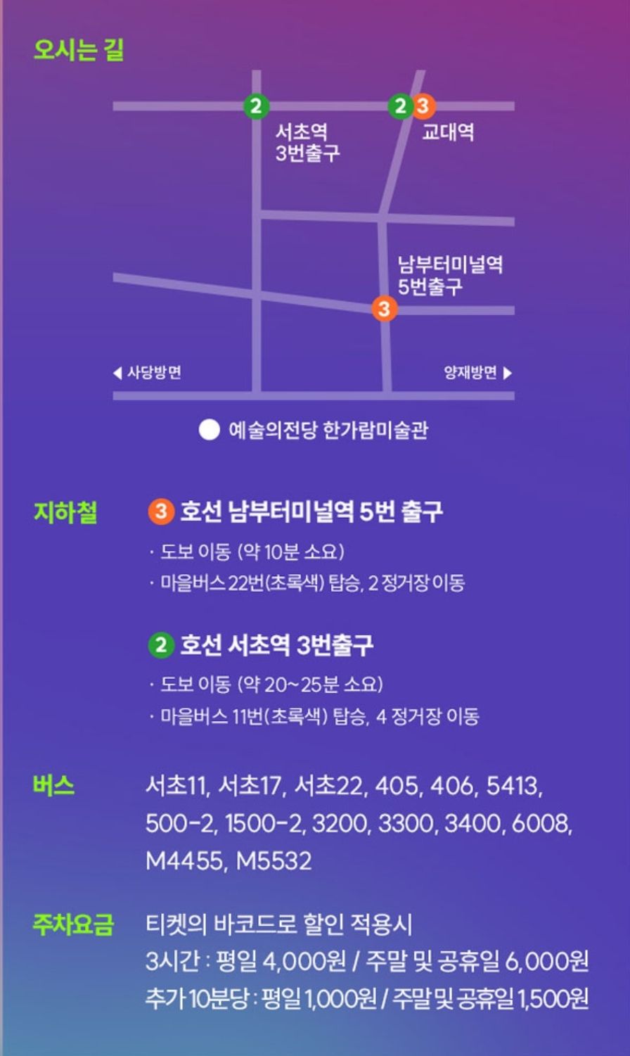 전시장인 예술의 전당은 3호선 남부터미널역 5번 출구에서 마을버스 22번을 타고 2정거장 오시거나