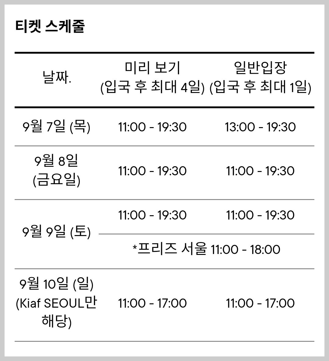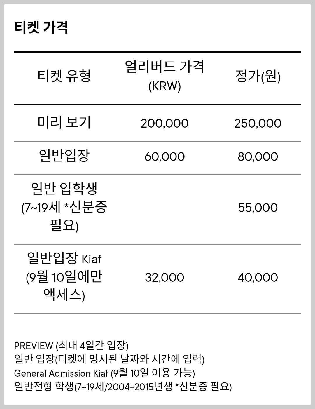 티켓은 프리뷰 티켓,(최대 4일 입장 가능) 일반티켓,(9월 7일 오후 1시부터~ 9월 9일 중 1일 입장으로 가능) General Admission kiaf 티켓(9월 10일만 입장가능, 프리즈서울은 9일 끝남)으로 나뉘고