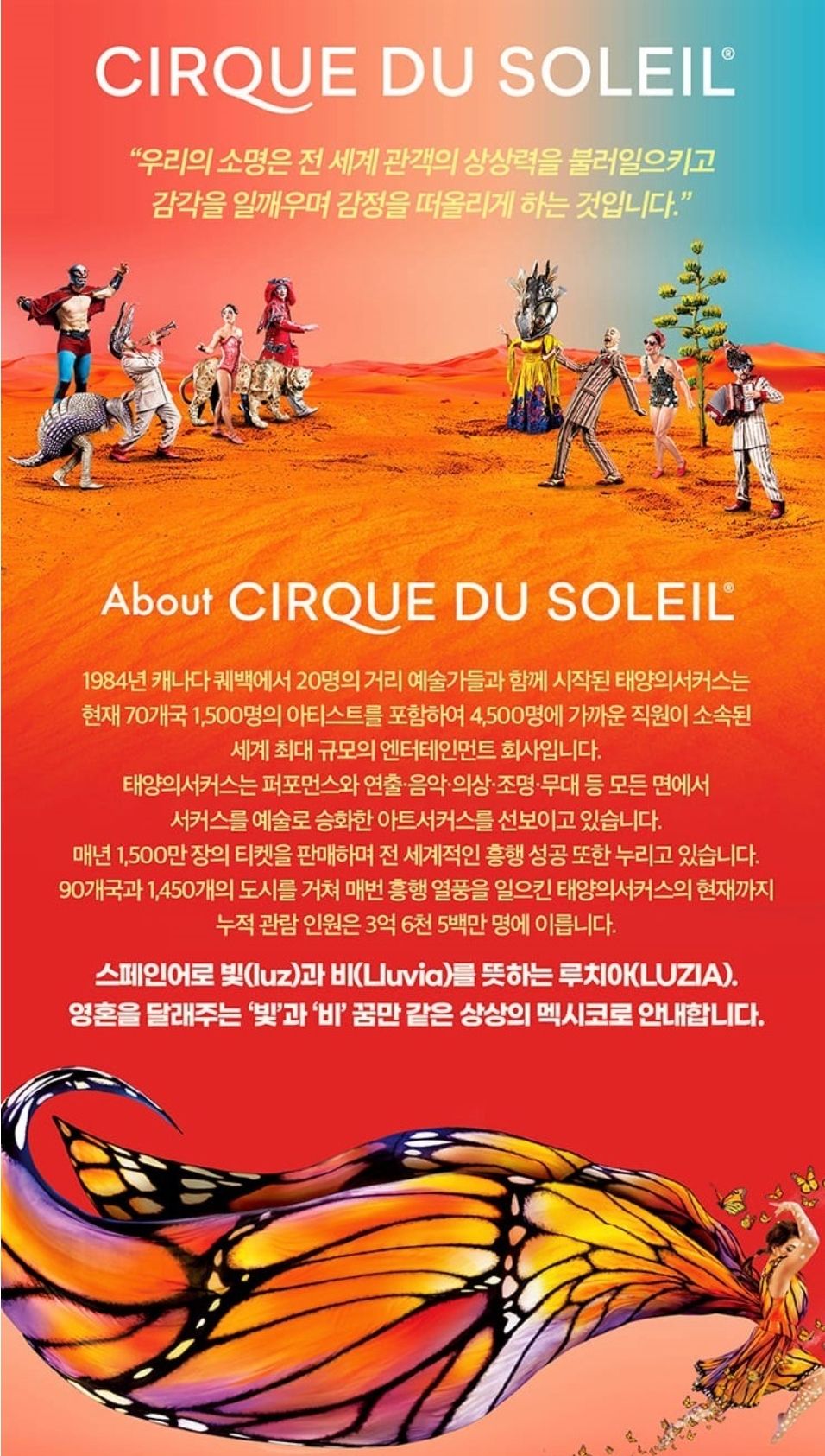 1984년 캐나다에서 20명의 거리 예술가들과 함께 시작된 태양의 서커스는 현재 70개국 1,500명의 아티스트를 포함하여 4,500명에 가까운 직원이 소속된 세계 최대 규모의 엔터테인먼트 회사라고 하네요.