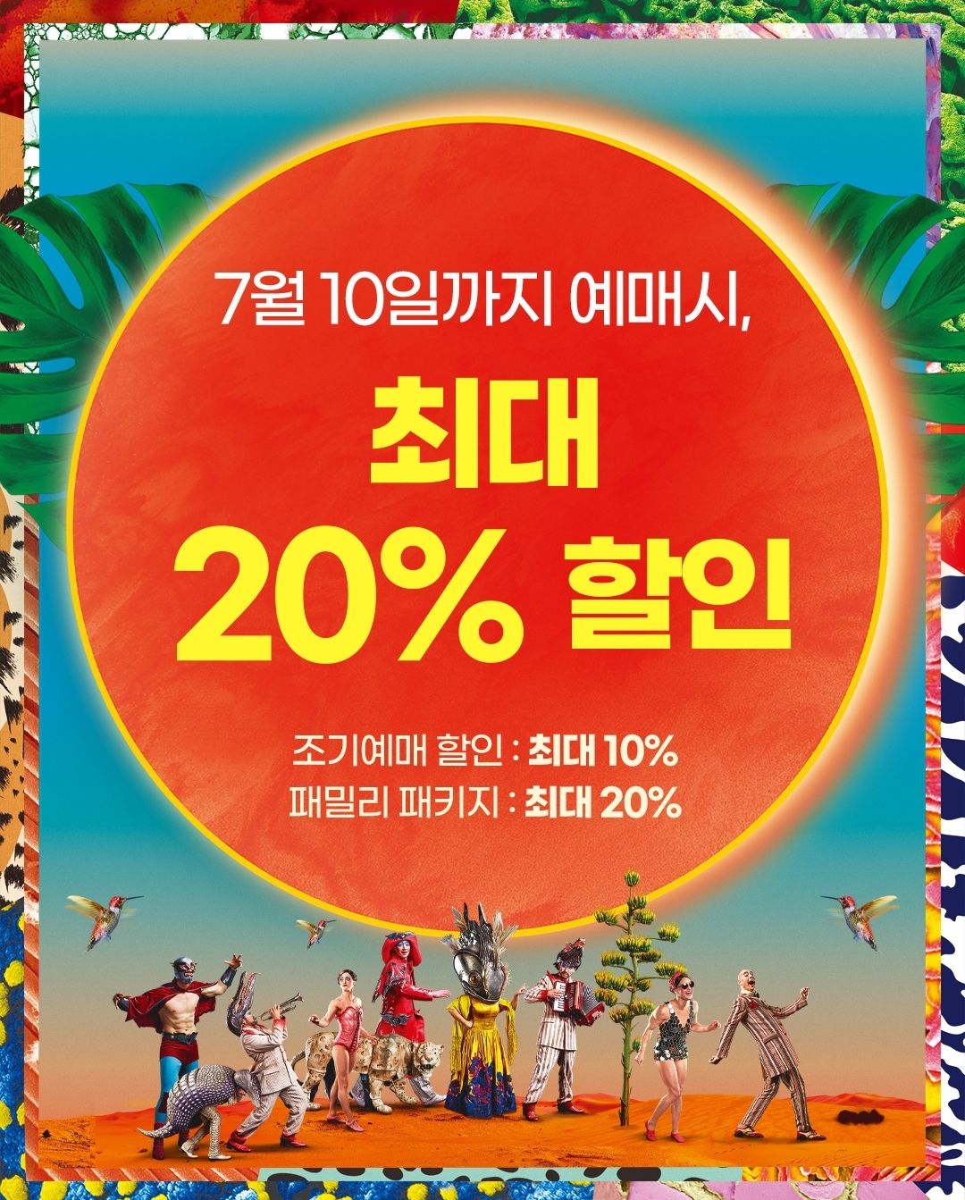 태양의 서커스는 7월 10일까지 예매하면 최대 20% 할인을 받을 수 있습니다.