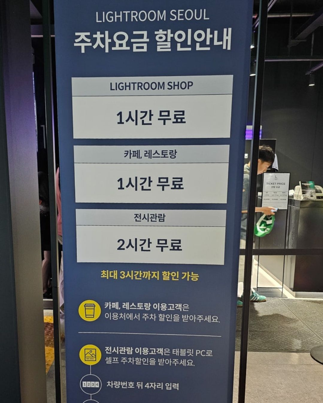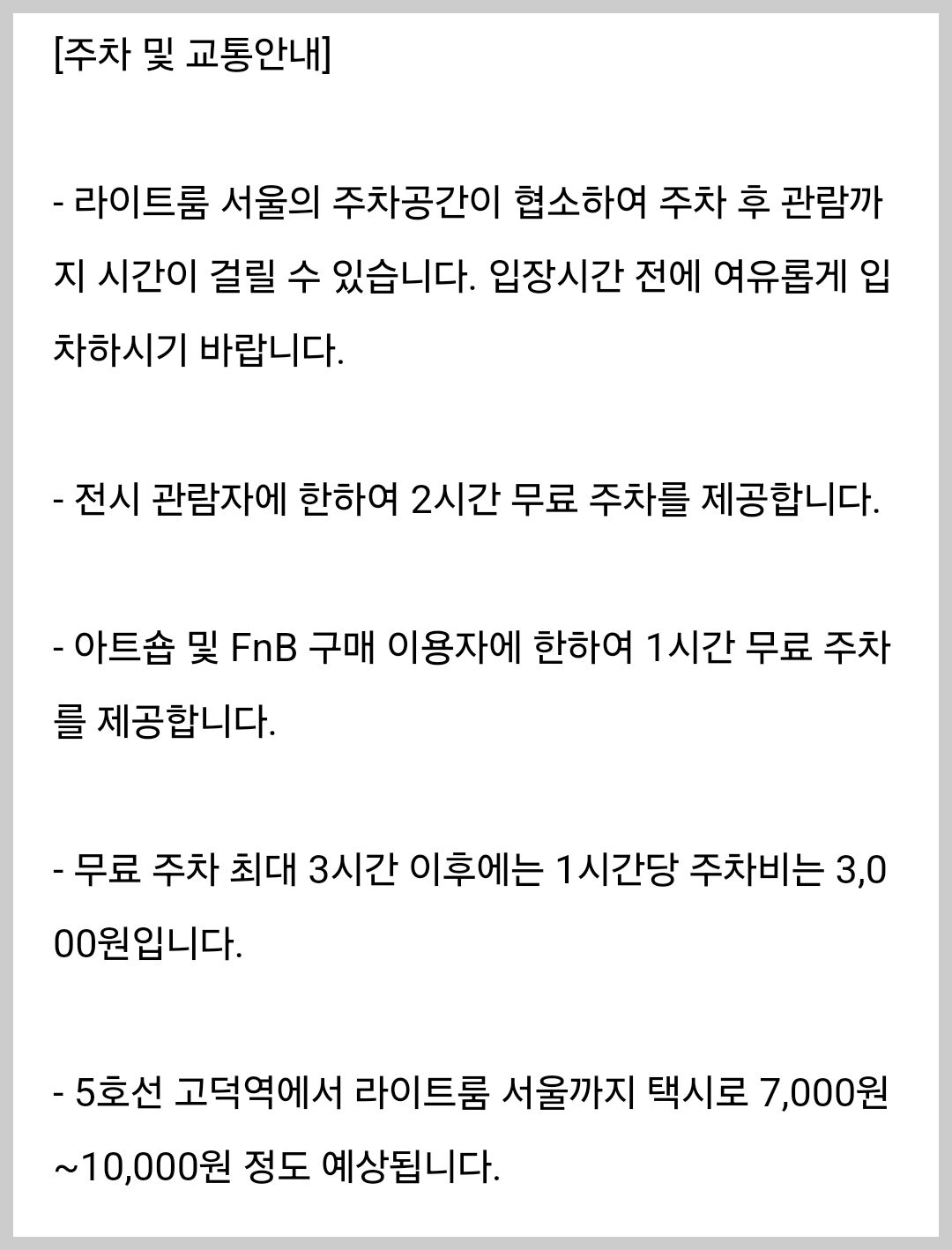 전시 관람시 2시간 주차가 지원되고, 아트샵 및 FnB 구매 이용자에게는 1시간 무료주차 제공하니까 최대 3시간까지 무료 주차가 가능합니다.