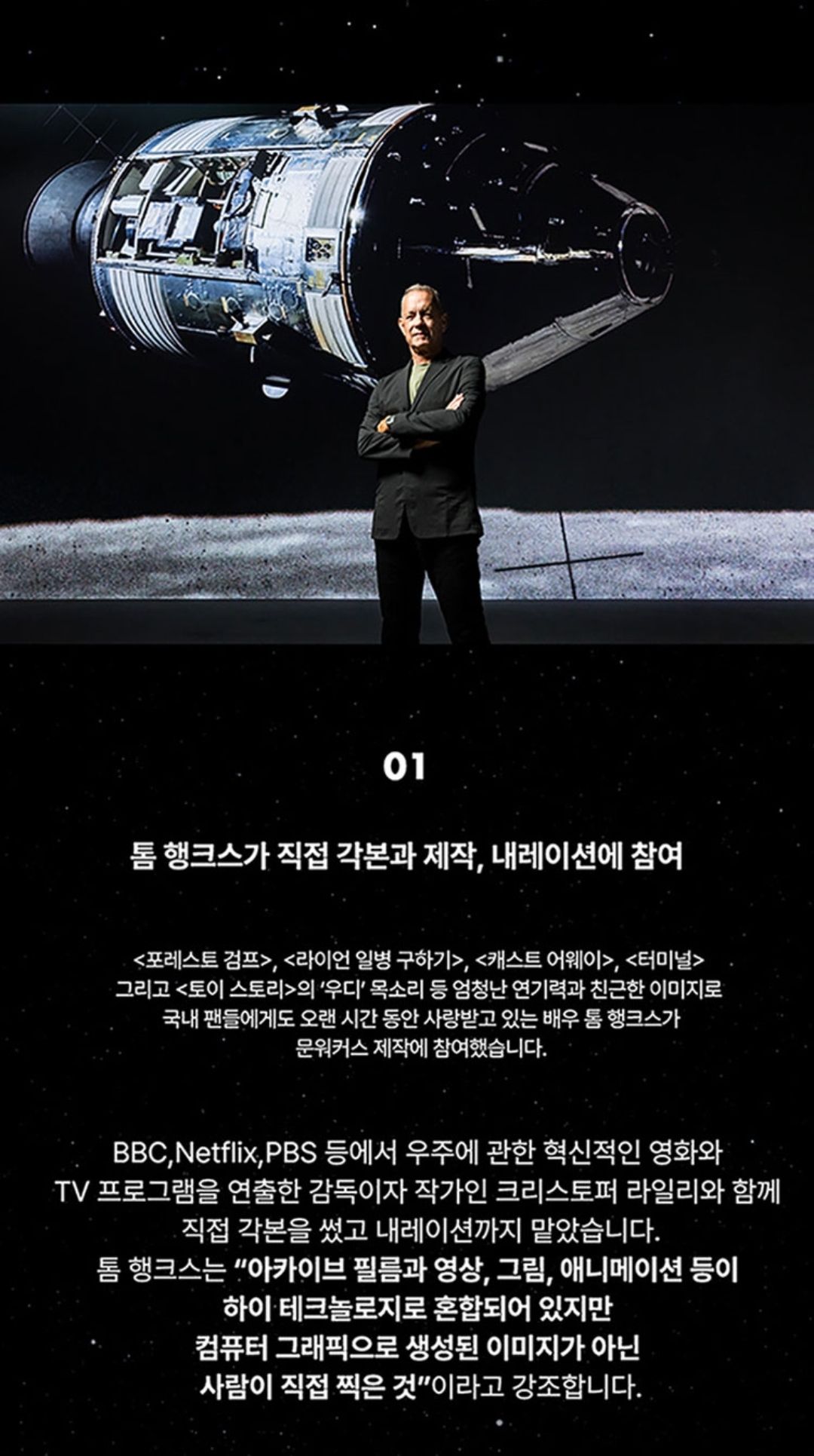 관람포인트 중 하나는 역시 배우 톰 행크스가 직접 제작에 참여했고 내레이션까지 맡았다는 것이겠죠.