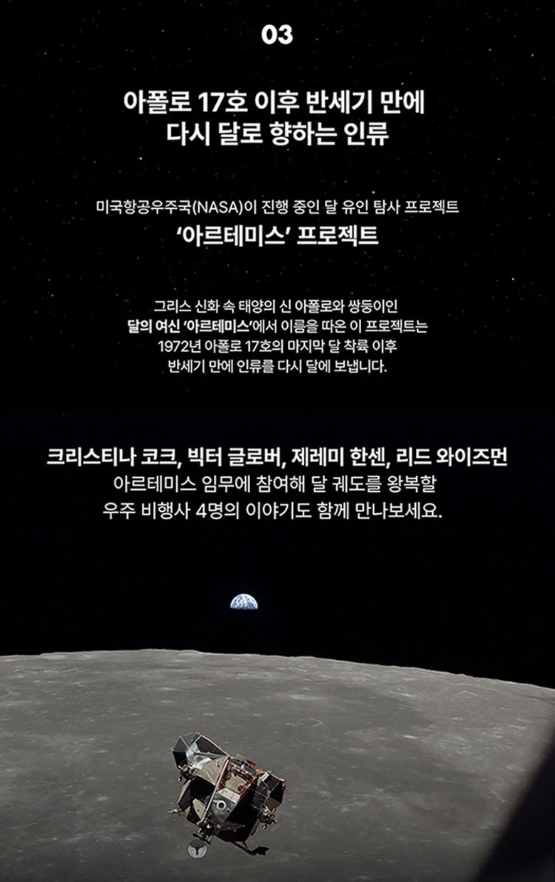 1972년 이후로 17호의 마지막 달 착륙 이후 반세기만에 인류를 다시 달에 보내는 '아르테미스' 프로젝트가 진행중이죠.