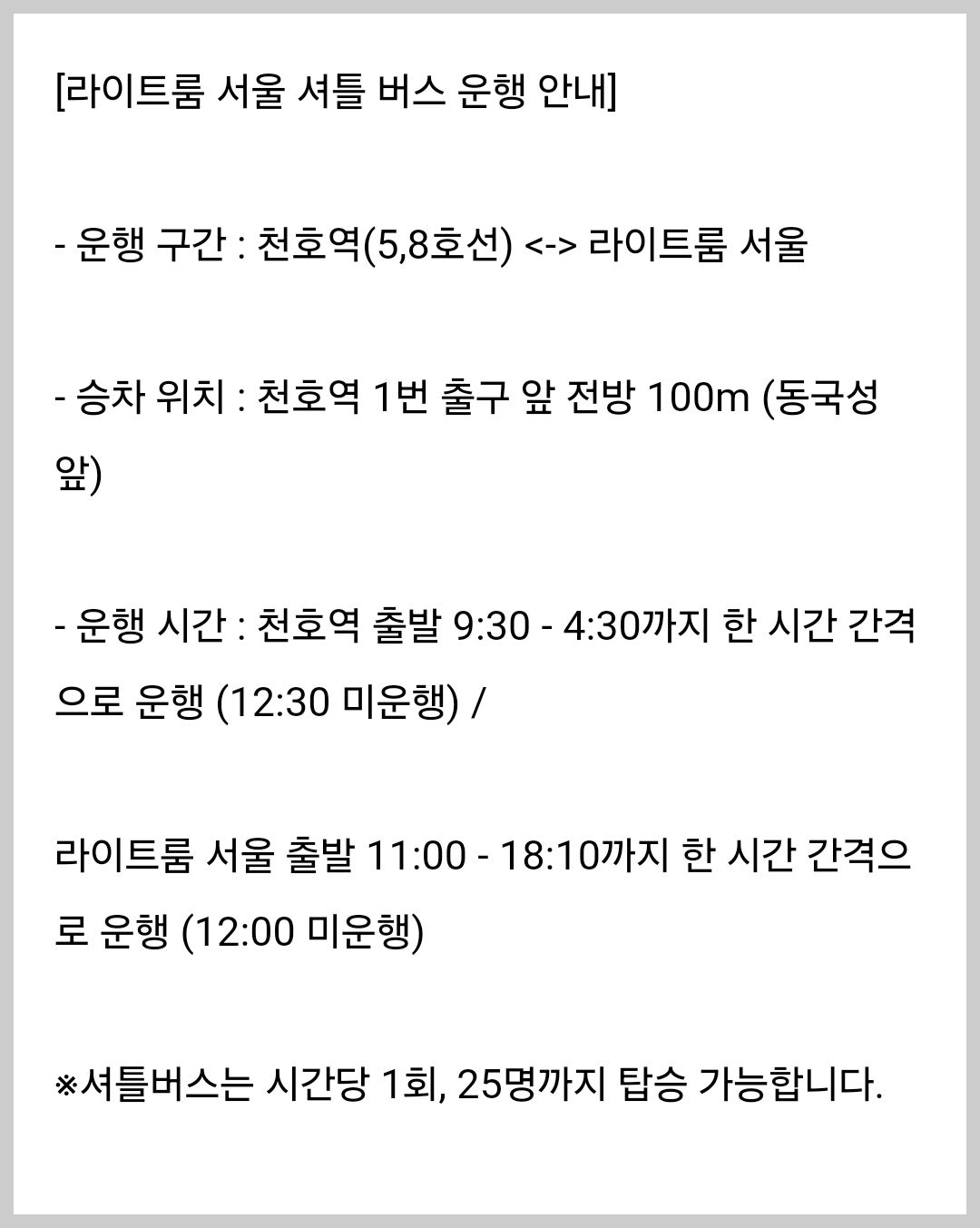 라이트룸 서울은 5,8호선 천호역 지하철역 1번 출구 앞에서 (중국집 동국성 앞) 출발하는 셔틀버스를 운행합니다.