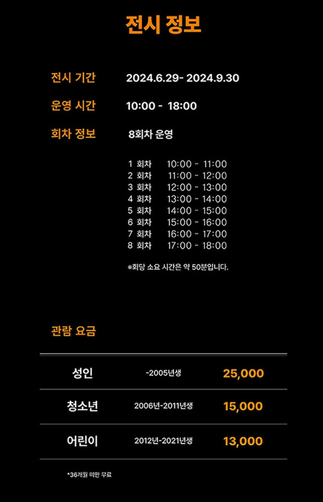 전시는 6/29~9/30일 진행되며 10시부터 18시까지 한시간 단위로 8회차를 운영합니다.