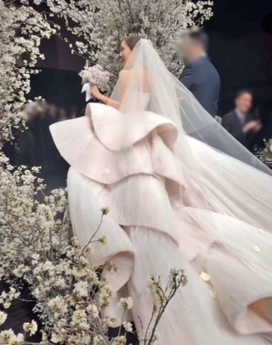 일부 지인들을 통해 결혼식 현장 사진이 공개되었는데 1부에서는 튜브탑으로, 스커트 부분이 굉장히 풍성한 독특한 디자인의 드레스를 착용했고
