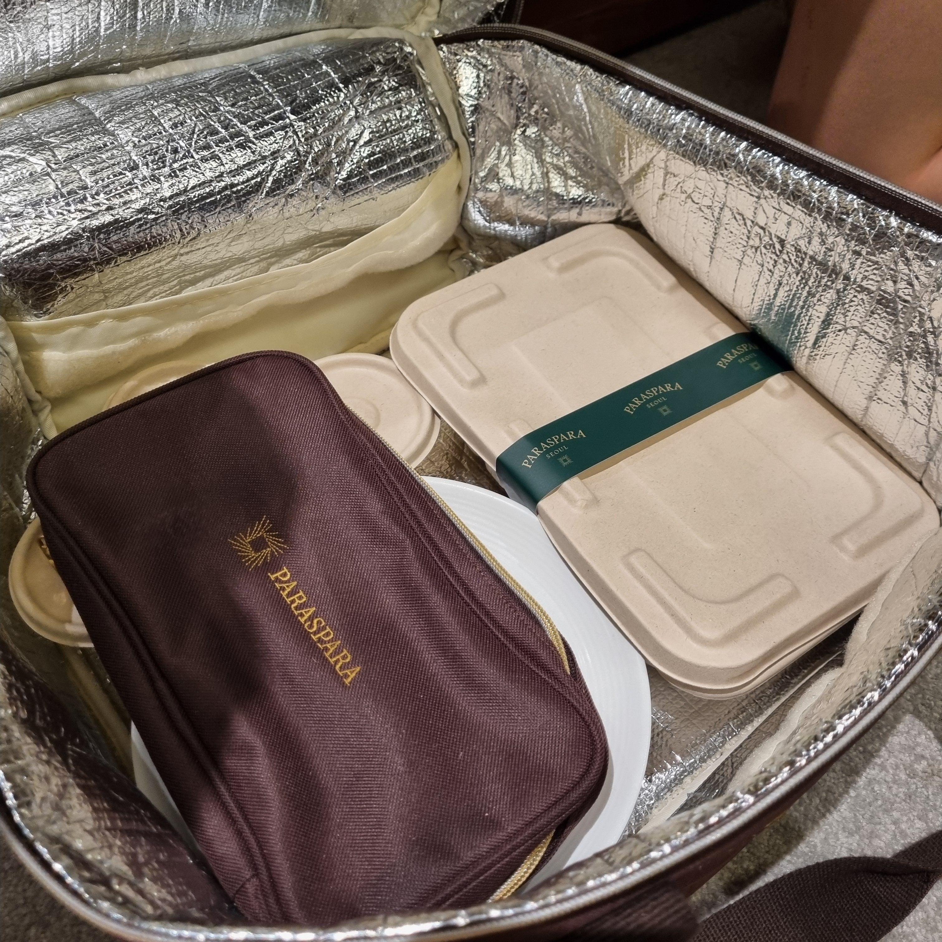 너무 깔끔하게 커트러리와 앞접시와 도시락으로 포장된 음식들.