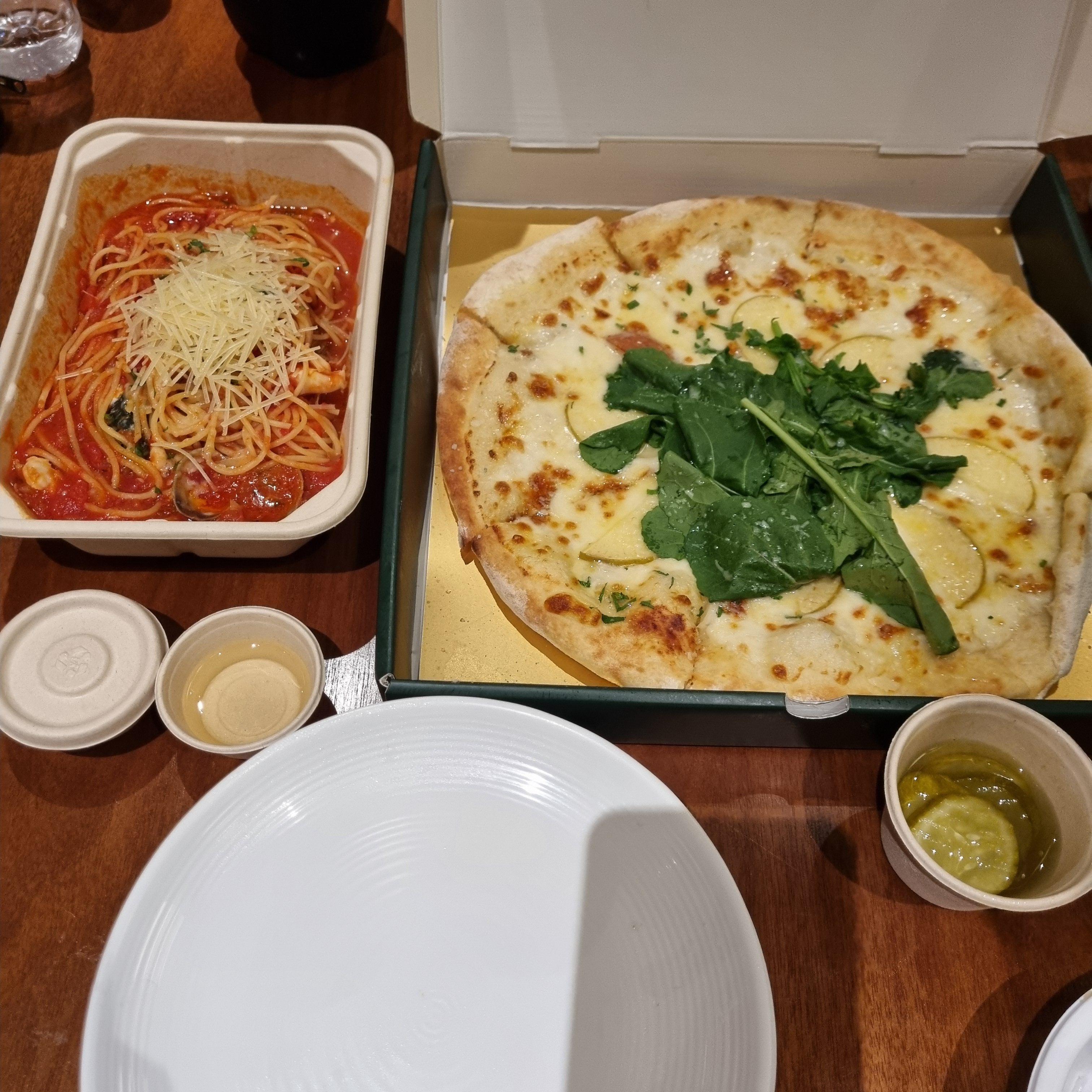 고르곤졸라 피자 따뜻하니 맜있고 루꼴라와 사과도 토핑되어 있었어요.