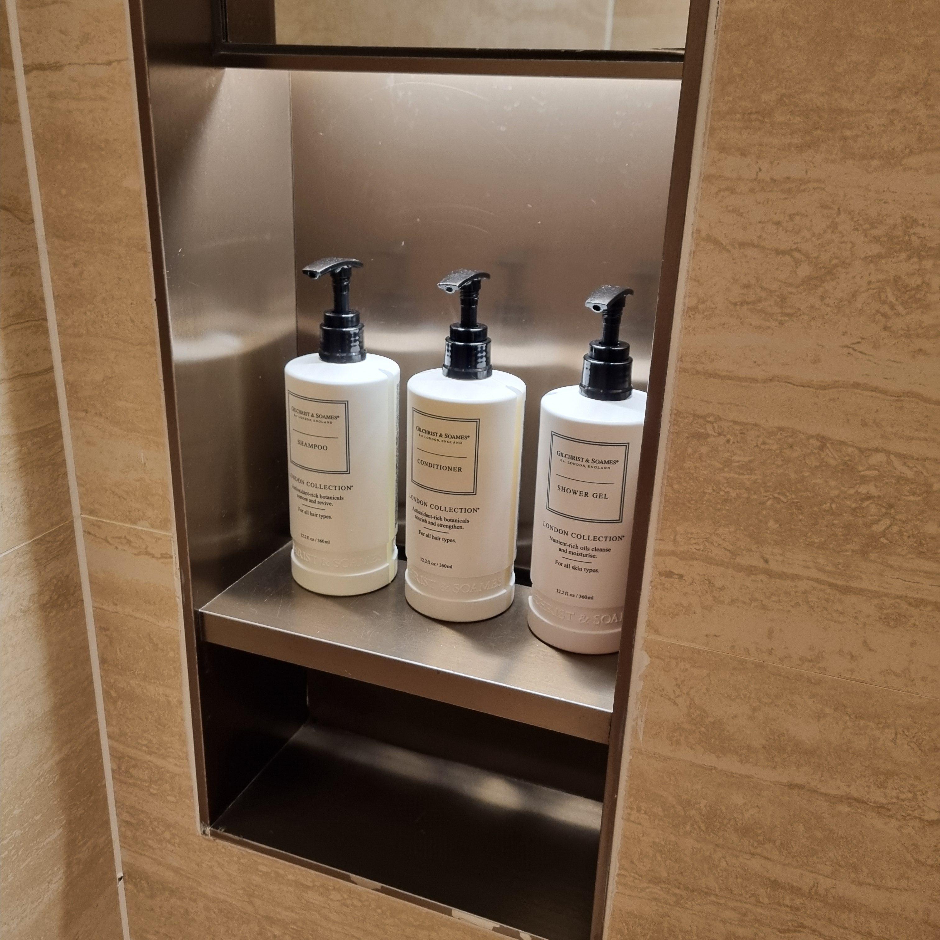 샤워부스안에 샴푸, 컨디셔너, 샤워젤.
