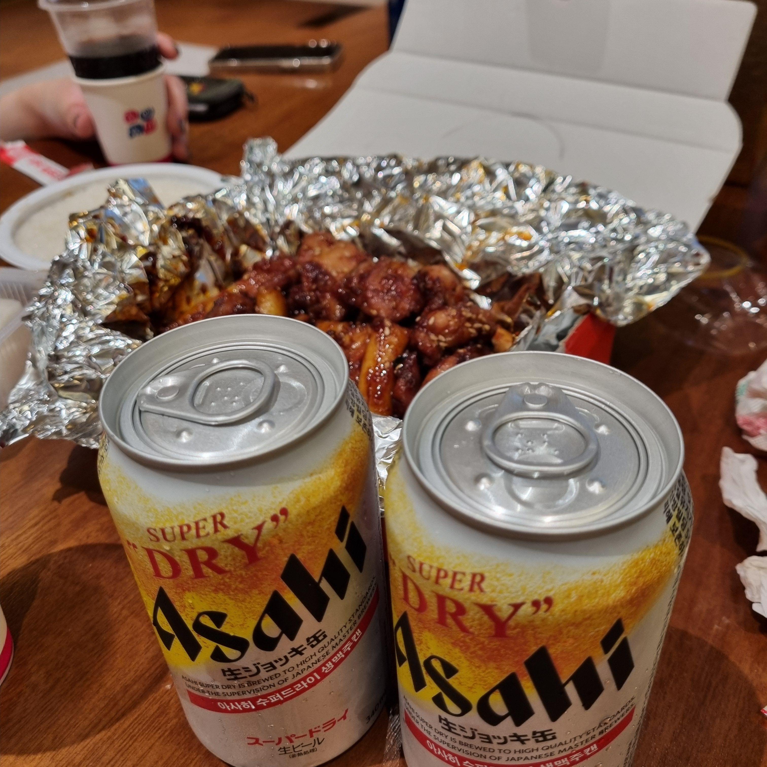저희는 편의점에서 아사히 생맥주캔을 사왔고 비가와서 치킨을 배달시켰어요.
