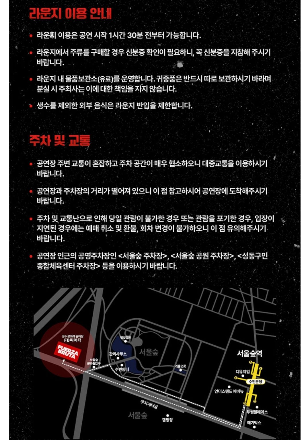 공연이 열리는 FB씨어터로 오시려면 서울숲역 3번 출구로 나와 20분 정도 걸어야 하는 걸 감안해서 대중교통으로 오실때 넉넉하게 출발하시는게 좋겠습니다.