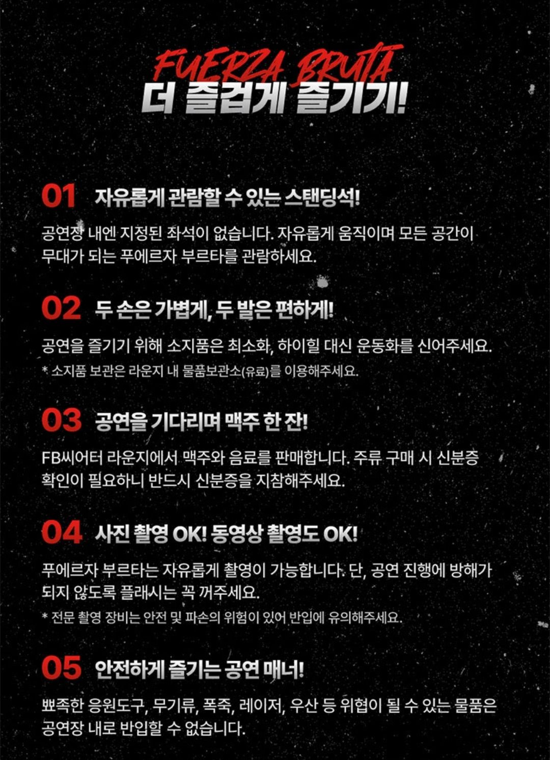 푸에르자부르타는 공연 시작 1시간 30분 전부터 티켓매표소가 운영되고 라운지 입장도 1시간 30분 전부터 가능합니다.