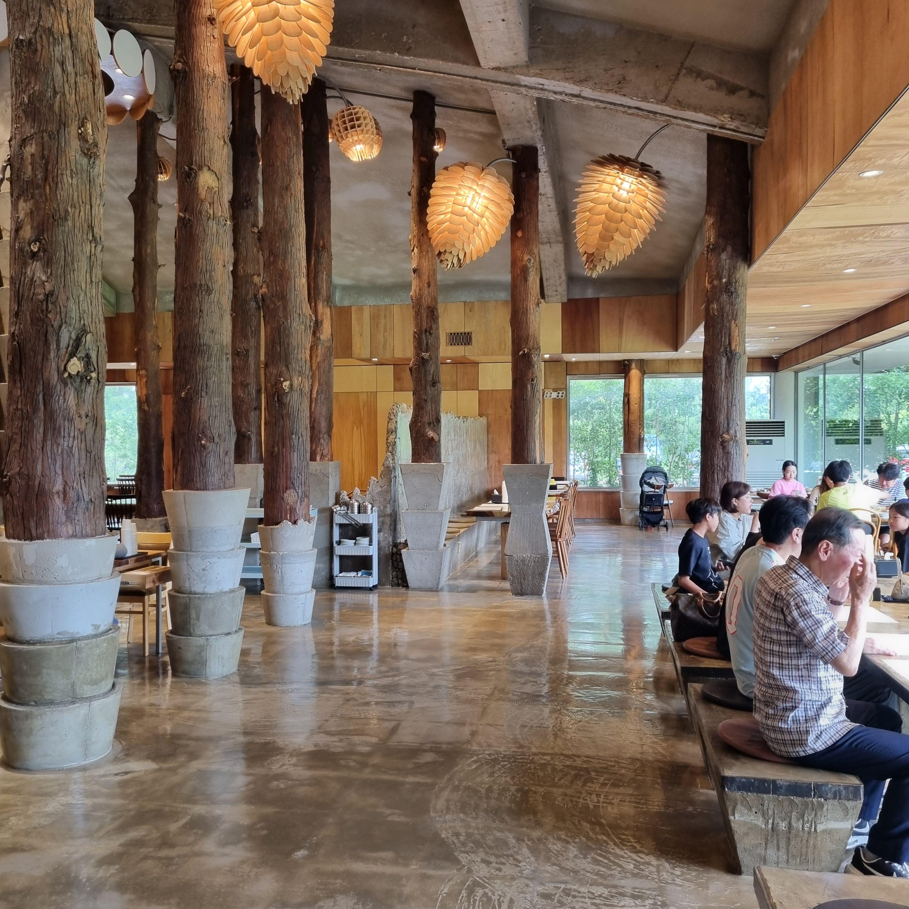 안은 천고가 높은데다 나무로 인테리어 되어있고 솔방울모양의 조명이 세련되면서 따뜻한 느낌을 줍니다.