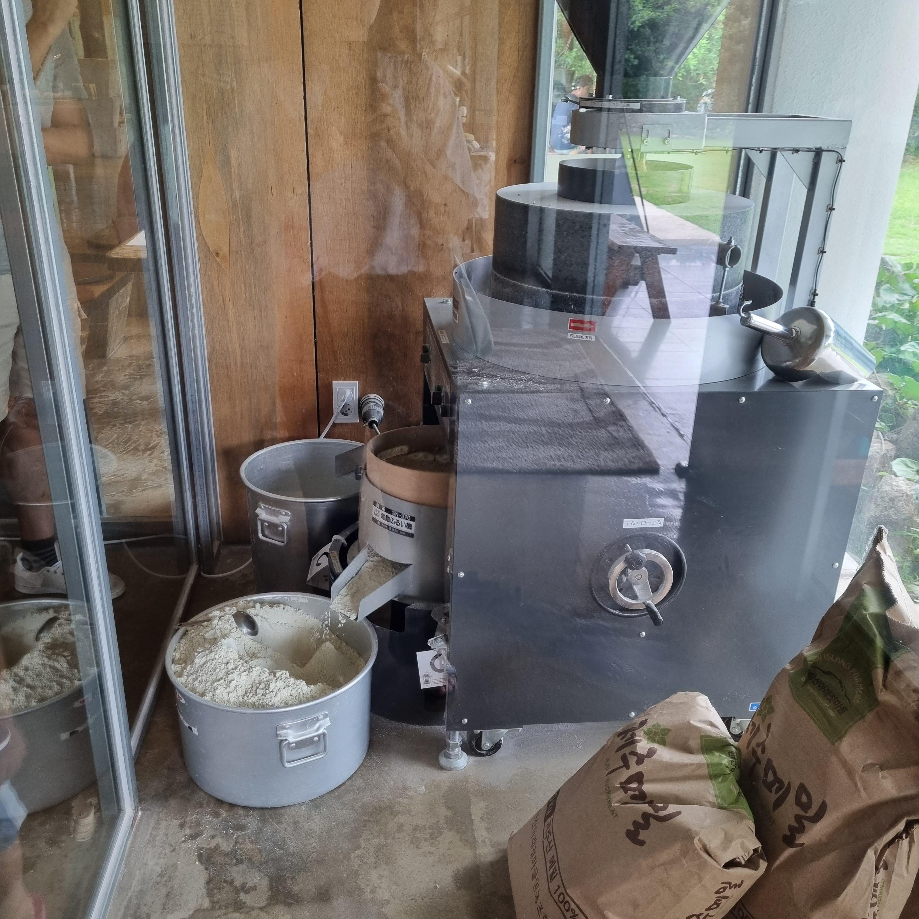 궁같은 입구로 들어가면 제주메밀을 빻고 있는 기계가 보입니다.