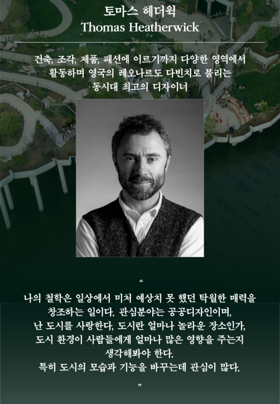 헤더윅 스튜디오는 1994년 토마스 헤더윅이 설립한 런던 기반의 스튜디오인데, 런던, 뉴욕, 상하이, 싱가폴 등 세계 주요 도시에 세워진 헤더윅 스튜디오의 건축물은 다양한 재료의 연구와 최첨단 엔지니어링 기법을 사용하면서 동시에 전통적인 장인 정신을 존중하는 디자인으로 만들어졌습니다.