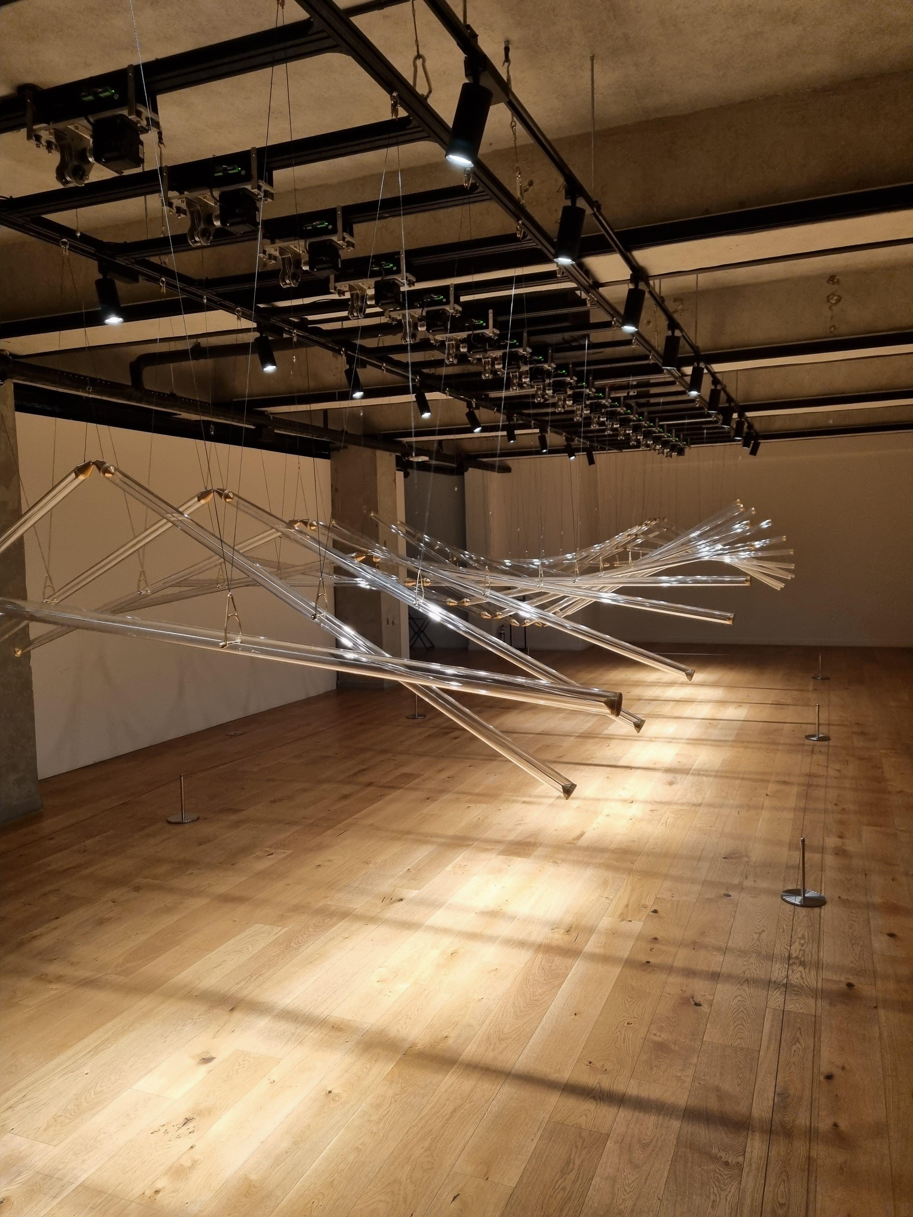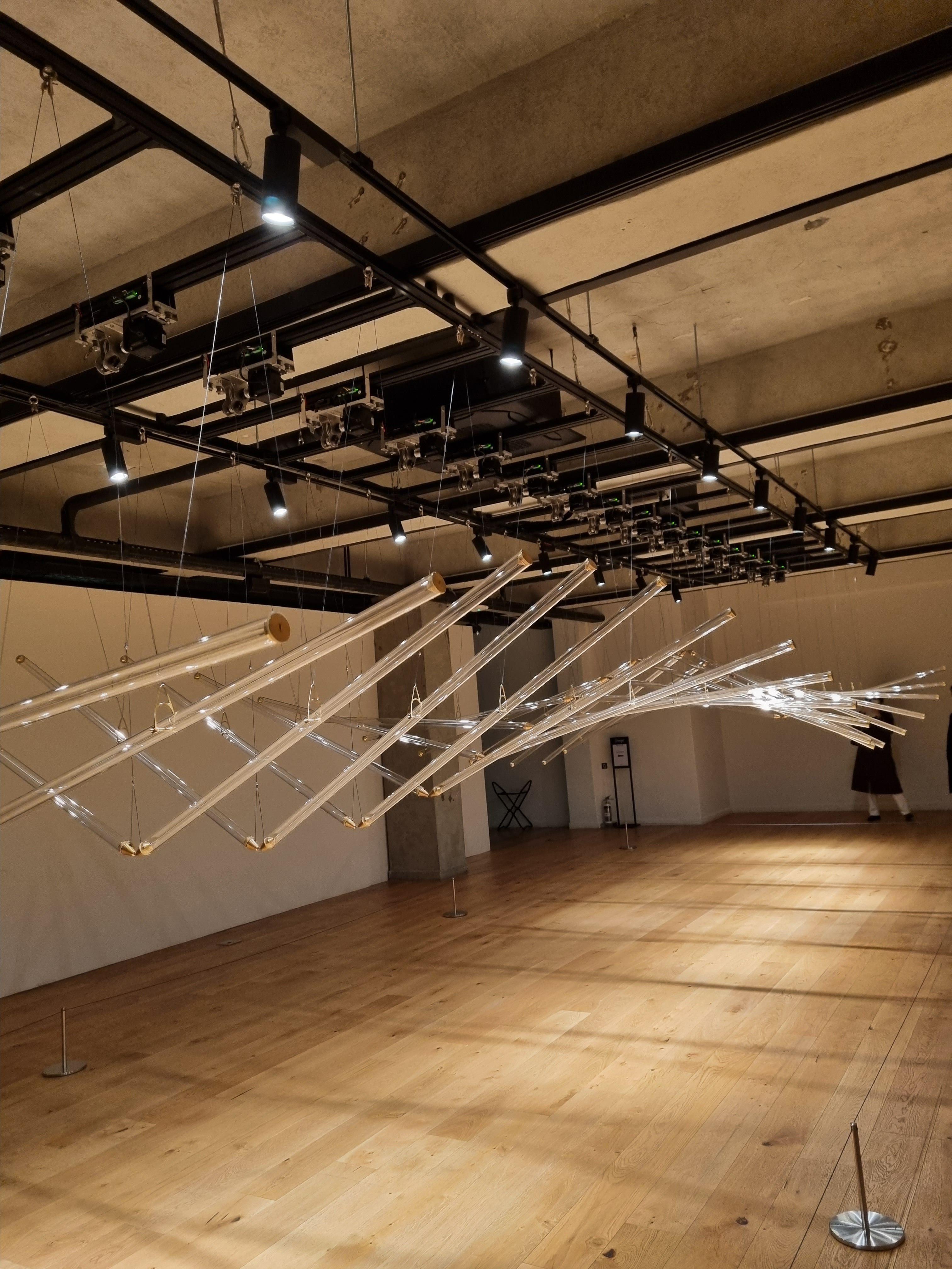 유리관에 섬세하게 조절된 조명 빛이 반사되면서 발생하는 부드러운 움직임과 조화는 무중력에 가까운 각과 더 나아가 신비롭고 숭고한 감정을 불러일으킵니다.