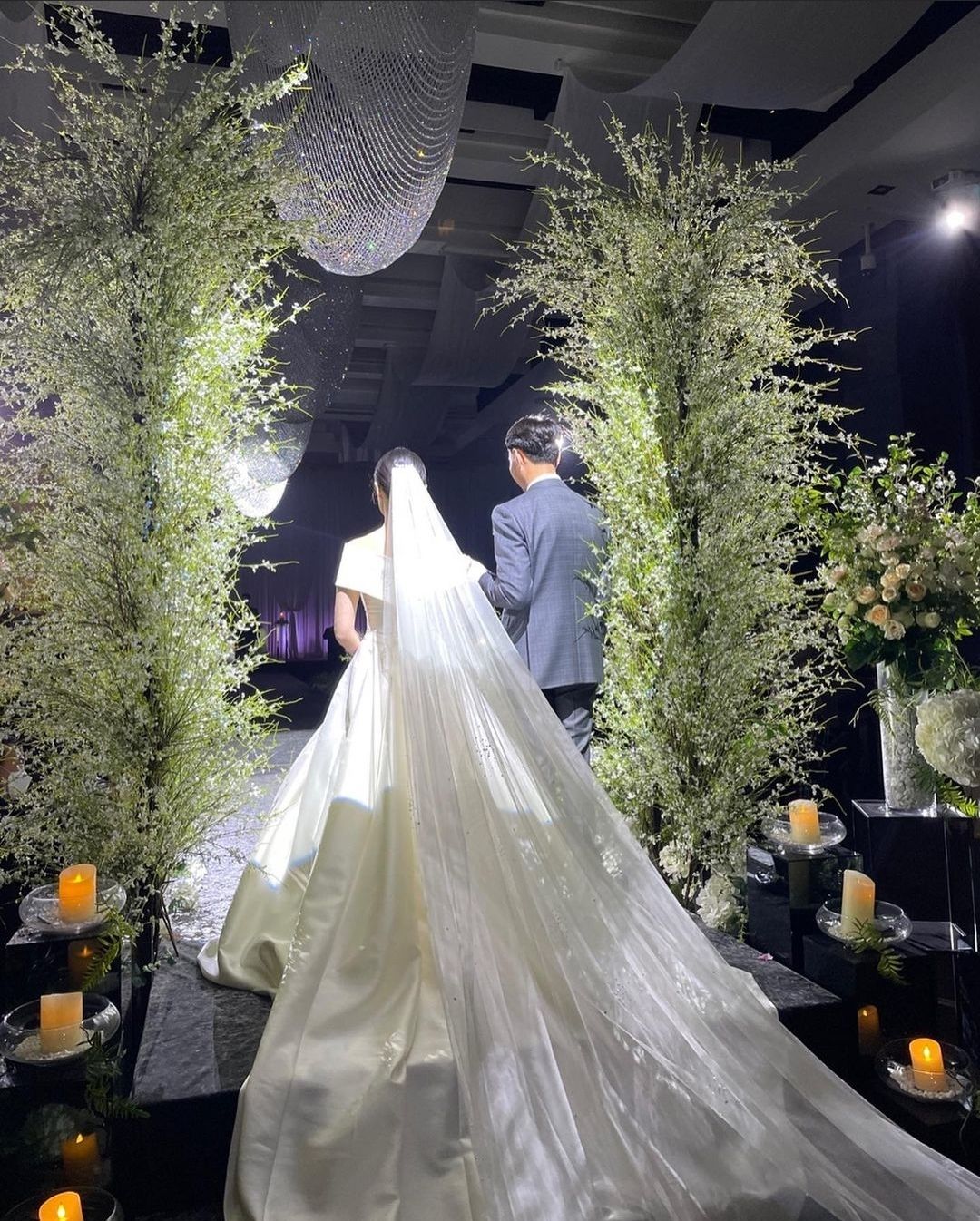 풍성하지 않은 슬림한 웨딩드레스를 입었다고 해도 베일이 화려하면 뒷모습은 충분하거든요.