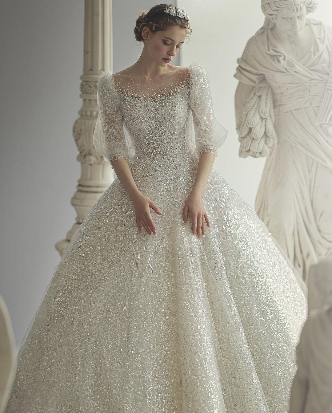 웨딩홀이 어두울수록 드레스의 비즈가 더 빛이 나는 효과를 볼 수 있죠.