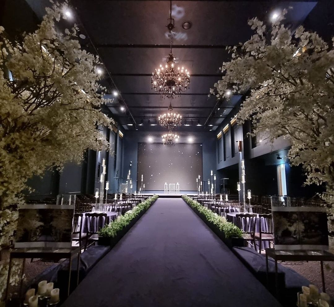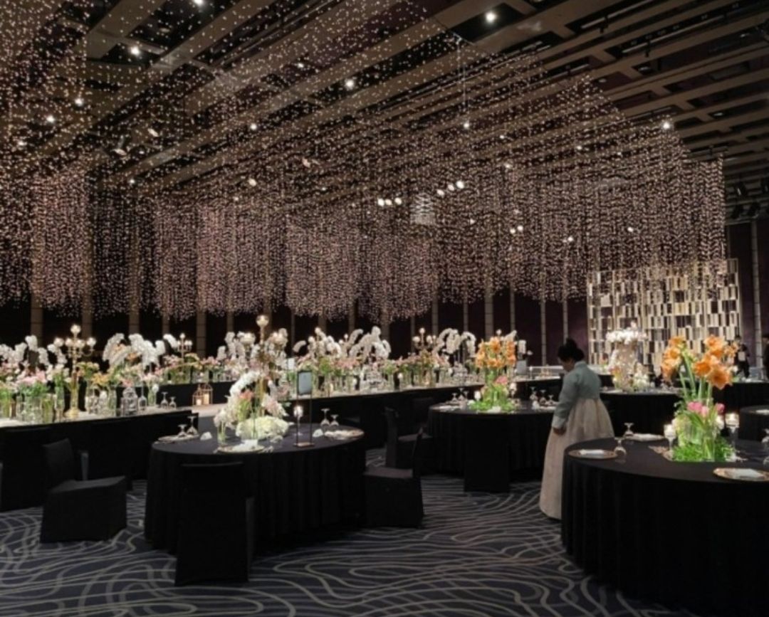 보통 실내 웨딩홀과 호텔예식들은 신부를 돋보이게 하기위해(신부의 로망을 위해라고 할수도 있지요) 바닥과 테이블색이 블랙이나 네이비등 어두운 경우가 많습니다.