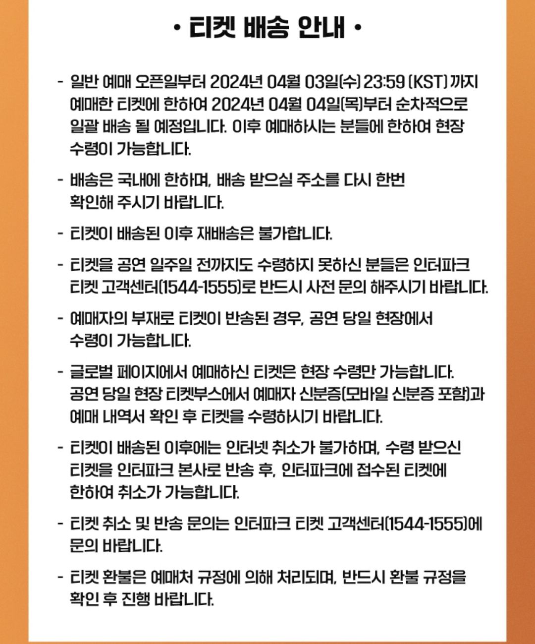 티켓 배송안내와 현장 수령 안내(예매내역서, 신분증 지참) 참고하세요.