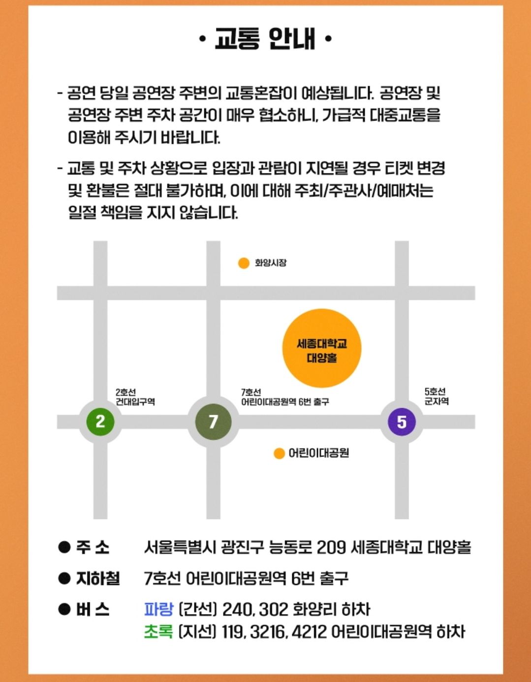 공연장 교통 및 주차 상황으로 입장과 관람이 지연될 경우 티켓 환불은 불가하다고 하니까 늦지않게 도착하셔야 하겠습니다.