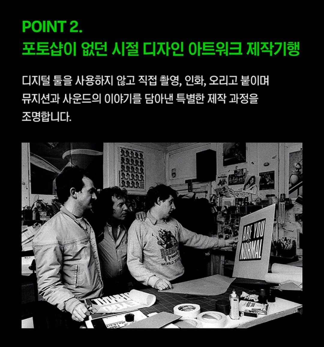 포토샵이 없던 시절 디지털 툴을 사용하지 않고 직접 촬영, 인화, 오리고 붙이며 뮤지션과 사운드의 이야기를 담아낸 특별한 제작 과정을 조명하고