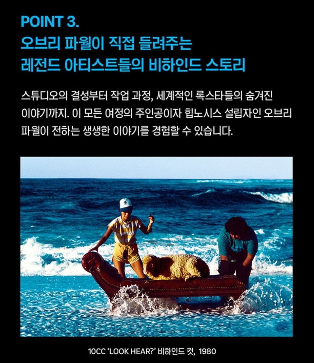 스튜디오의 결성부터 작업 과정, 세계적인 톱스타들의 숨겨진 이야기까지, 이 모든 여정의 주인공이자 힙노시스의 설립자인 오브리 파월이 전하는 생생한 이야기를 경험할 수 있다고 합니다.