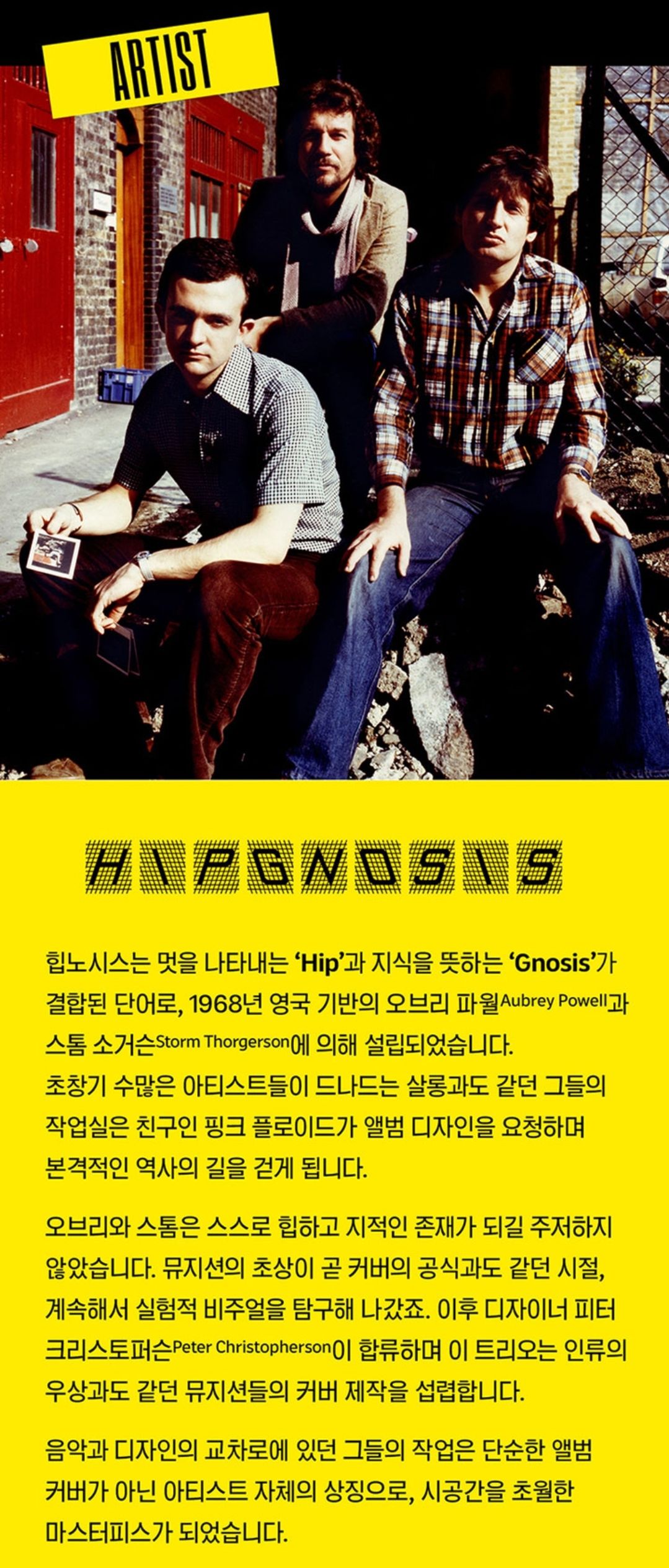힙노시스는 멋과 지식을 뜻하는 두단어가 결합된 뜻으로, 1968년 영국 기반의 오브리 파월과 스톰 소거슨에 의해 설립되었습니다.