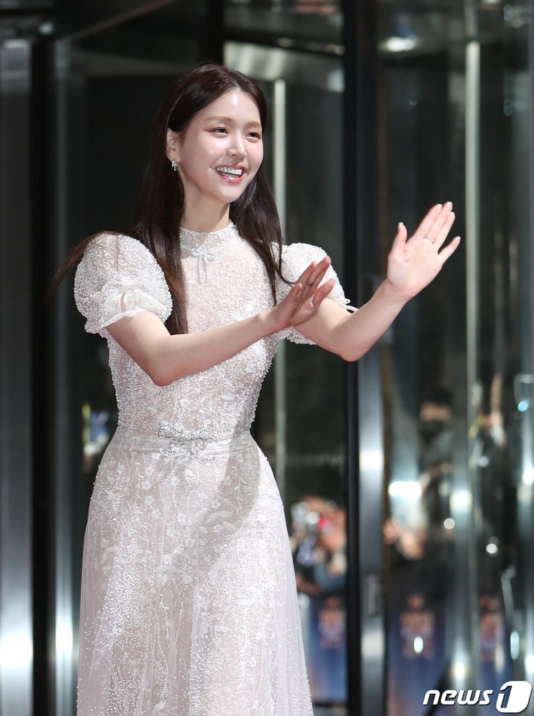 웨딩드레스처럼 풍성한 화이트 볼가운드레스를 입은 류현경