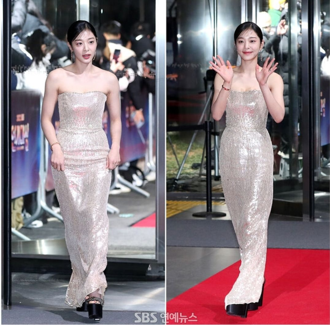 인어비늘처럼 반짝이는 실루엣의 드레스를 입은 설인아. 그녀가 입은 브랜드는 제니팩햄입니다.