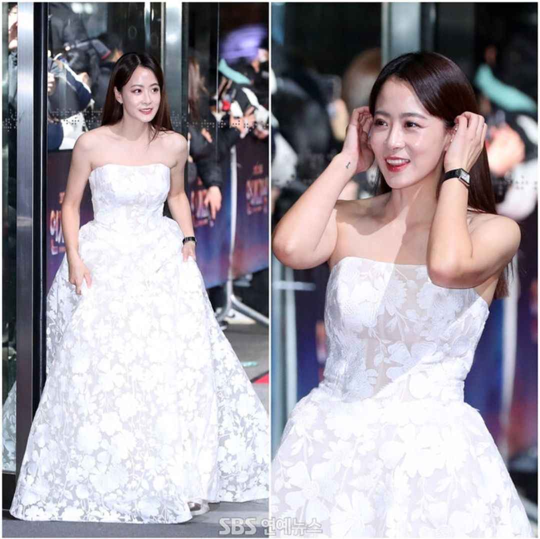 웨딩드레스처럼 풍성한 화이트 볼가운드레스를 입은 류현경
