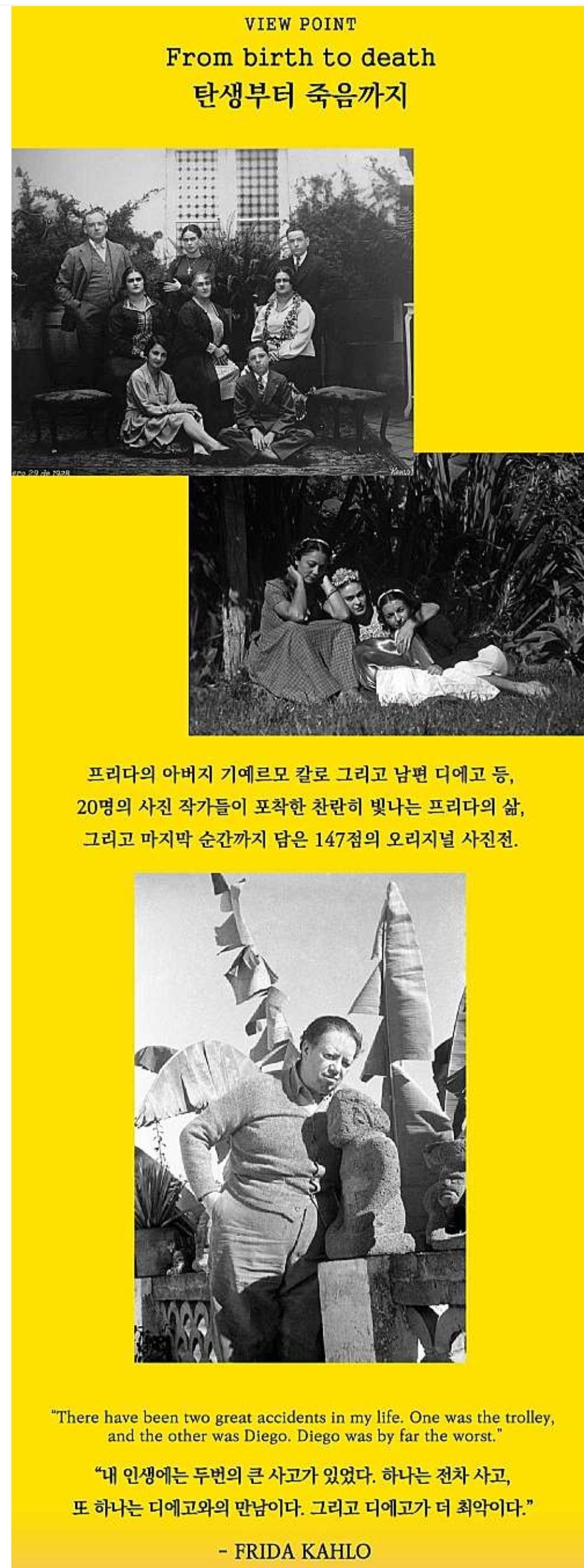 이번 <프리다 칼로 사진전 : 삶의 초상> 전시는 이탈리아 5개 도시 순회를 마치고 한국에서 처음으로 열리는 프리다 칼로 단독 사진전이며 프리다의 아버지 기예르모 칼로 그리고 남편 디에고 등, 20명의 사진 작가들이 포착한 찬란히 빛나는 프리다의 삶, 그리고 마지막 순간까지 담은 147점의 사진들이 전시됩니다.