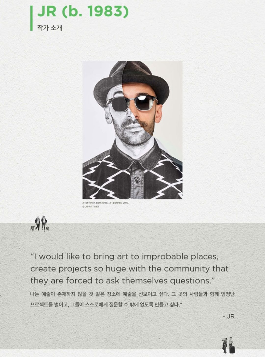 2019년 뉴욕 브루클린 미술관을 시작으로 독일 뮌헨 쿤스트할레에 이어 서울에서 아시아 최초로 선보이는 이번 전시는 제이알의 문화, 사회, 정치적 주제에 대한 관심과 대중과의 협업을 토대로 초기부터 지난 20여 년간 펼쳐 온 행보를 소개하고 나아가 공공예술로 그 의미를 어떻게 확장했는지 보여준다고 합니다.
