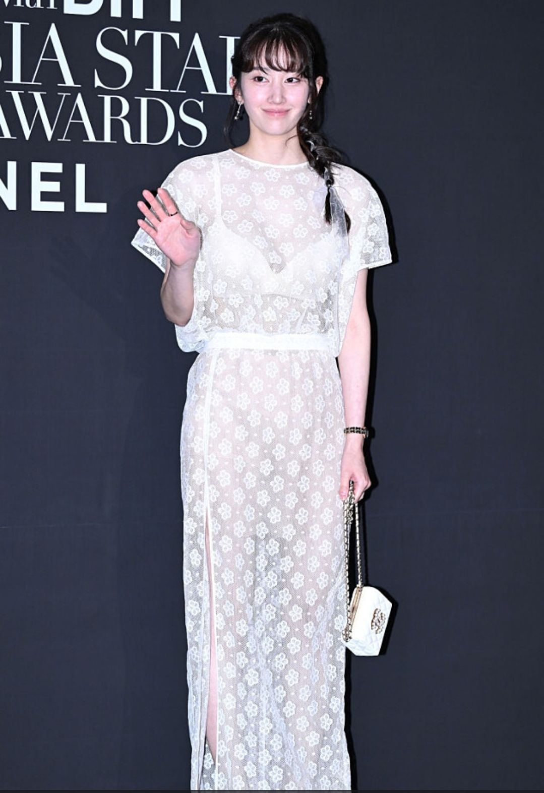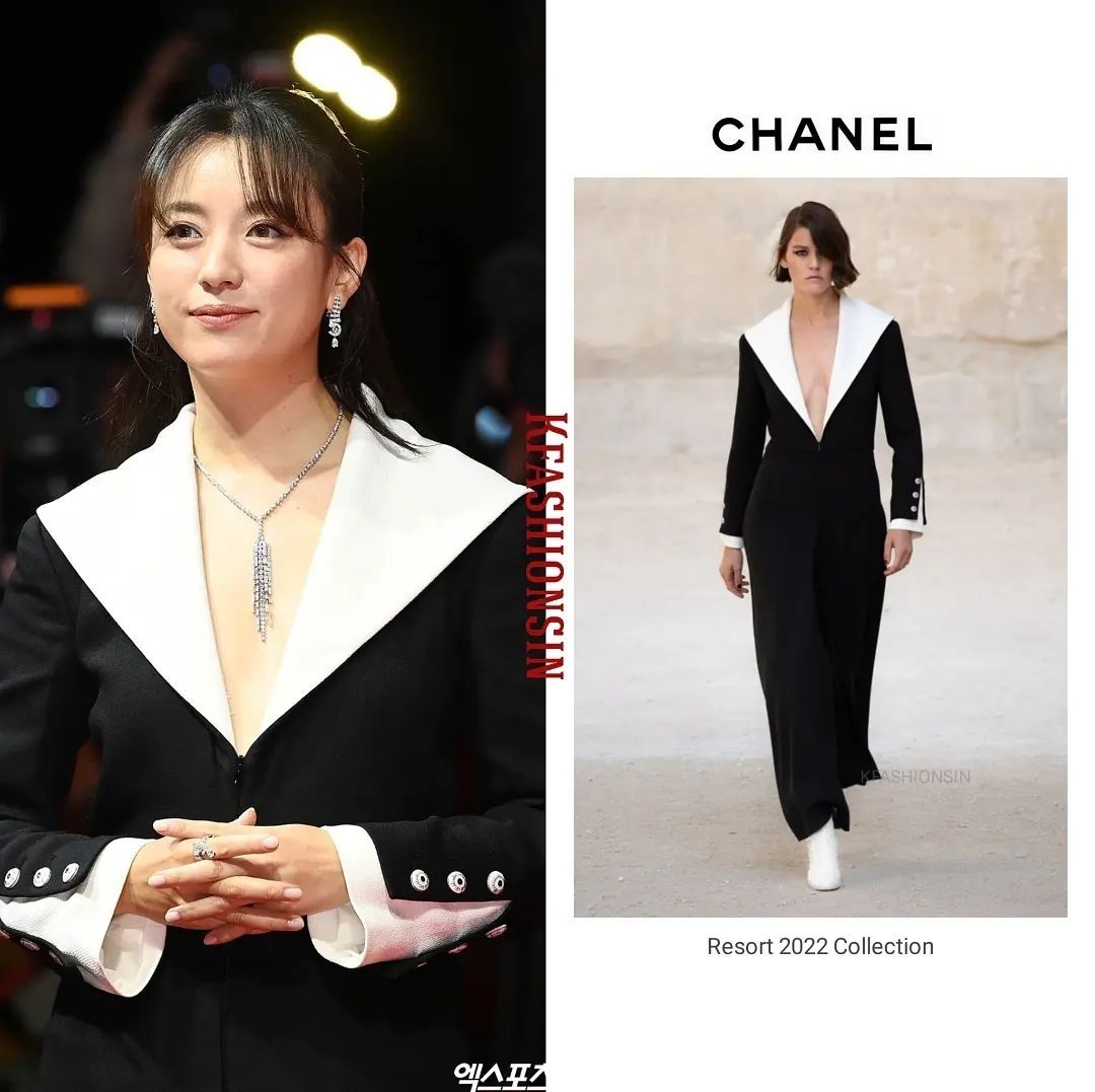 레드카펫에서 베르사체 블랙미니드레스를 입었던 이솜배우는 이번에 샤넬의 시스루레이스 드레스를 선택했습니다.