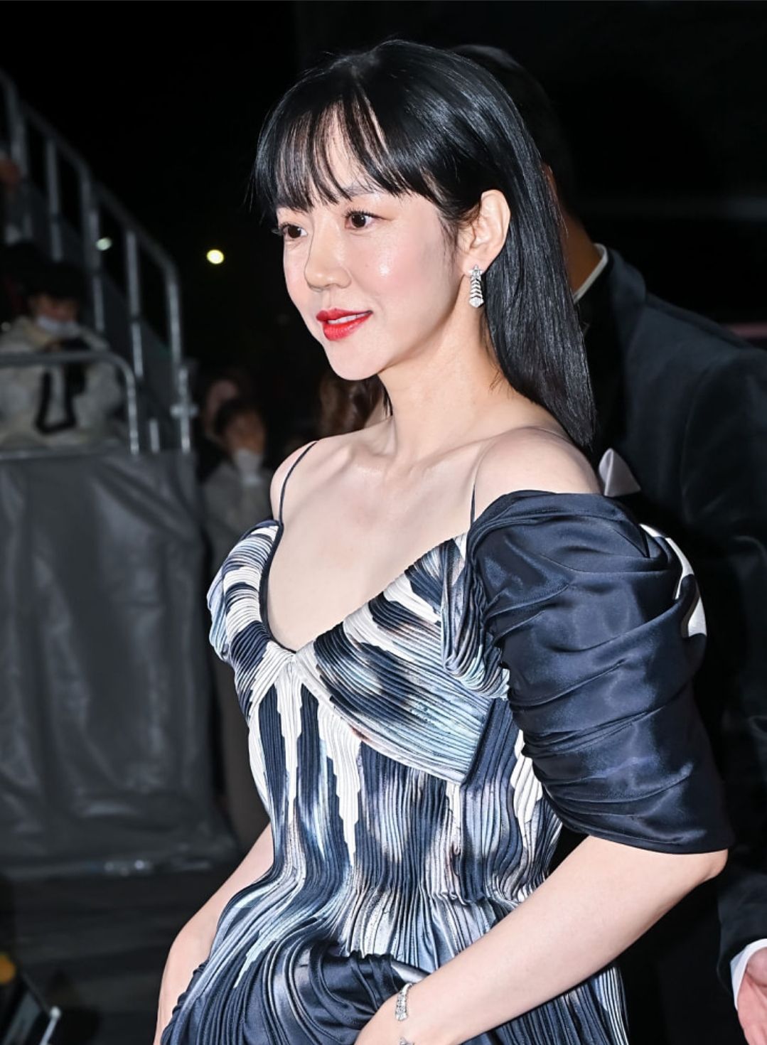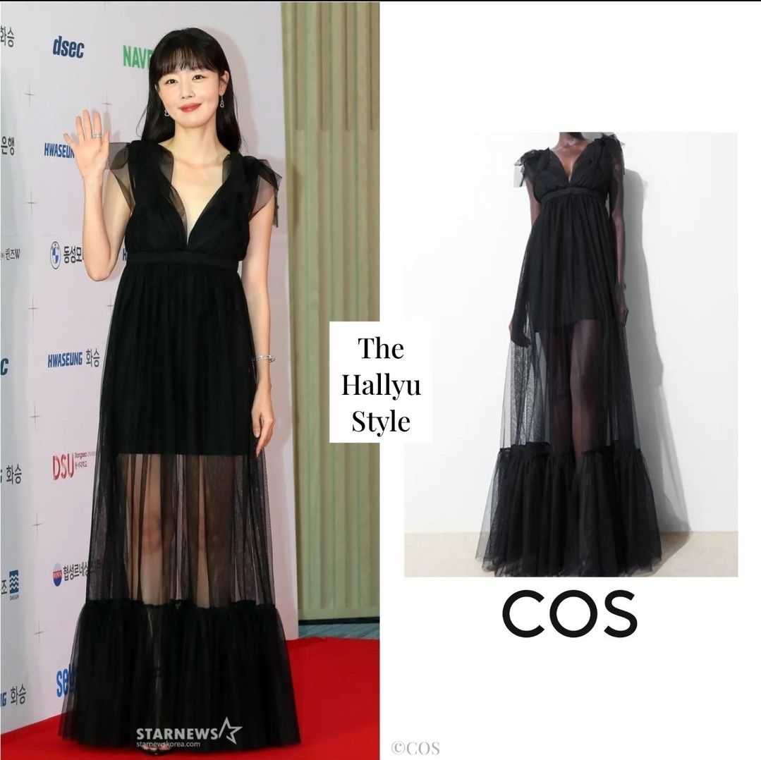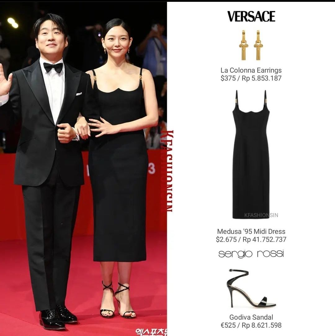 블랙 미디드레스와 샌들, 골드 악세사리로 포인트를 준 이솜의 레드카펫 의상.