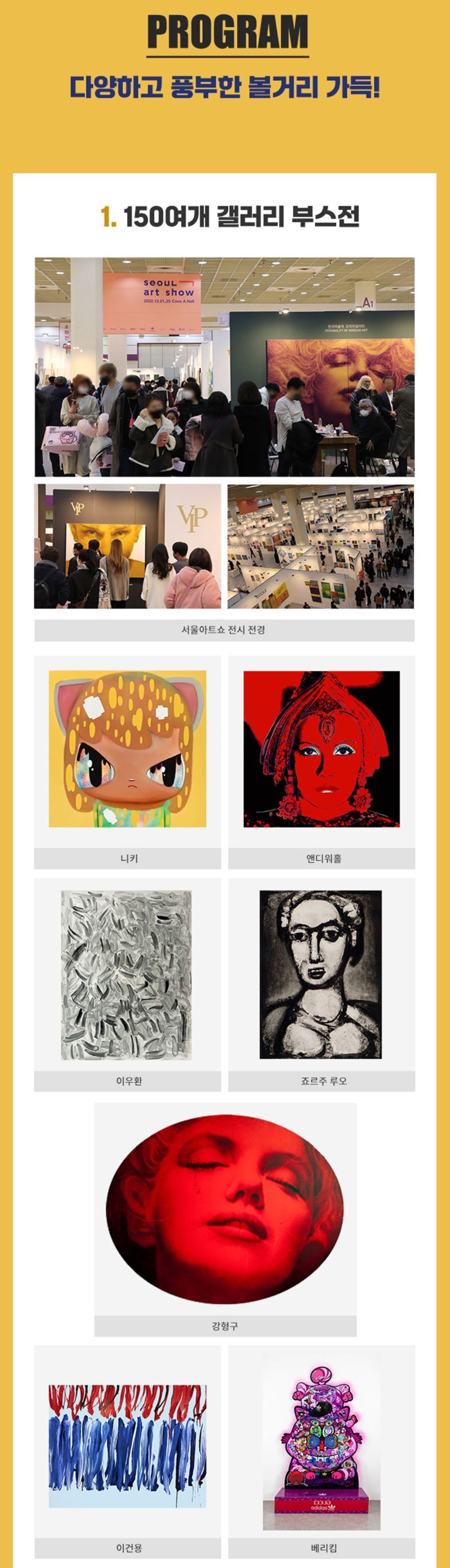 올해로 12회를 맞이한 서울아트쇼는 국내외 150여 개 유수 갤러리의 다양한 작품을 선보이는 부스전과 한국미술의 오리지널리티 특별전 등 풍부한 콘텐츠로 구성됩니다.