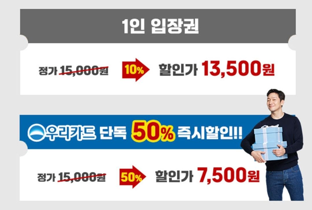 우리카드로 결재시 티켓값의 50%을 할인받을 수 있으니까 우리카드 있는 분들은 꼭 사용하세요.