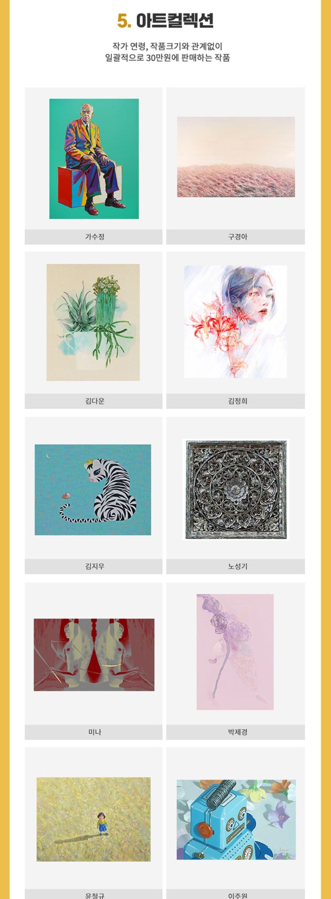 작가의 연령, 작품 크기와 상관없이 일괄적으로 30만원에 판매하는 '아트컬렉션'은 적은 돈으로 미술 컬렉터를 시작하고 싶은 분들을 위해 좋을 것 같습니다.