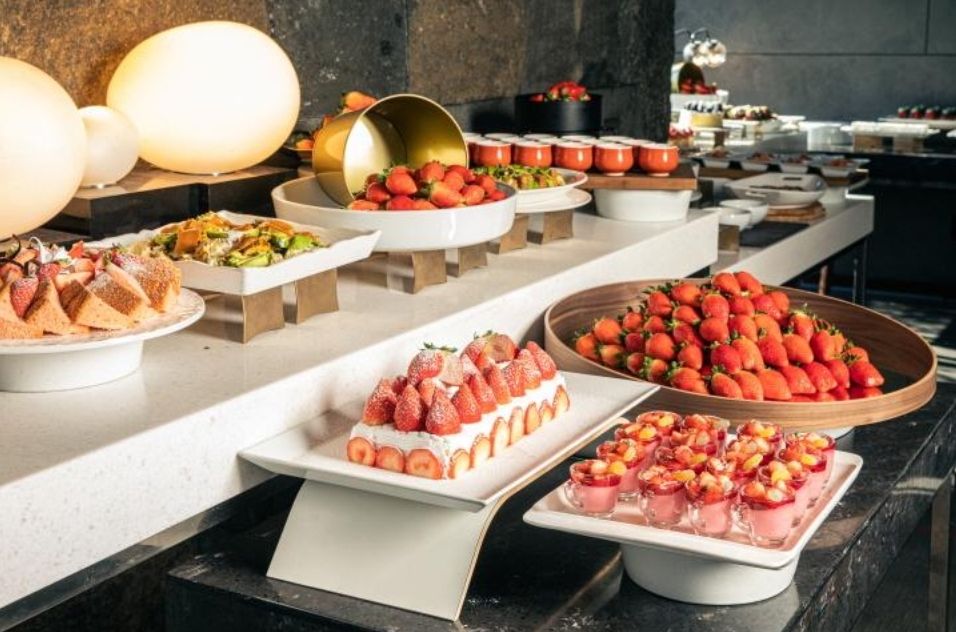 주말 딸기 뷔페는 딸기 보코치니 카프레제 샐러드, 딸기 크림 치즈&햄 샌드위치, 딸기 해산물 파스타 샐러드, 훈제 연어, 핫 디쉬로는 로제떡볶이, 딸기를 곁들인 탕수육, 딸기을 곁들인 치킨 가라아게, 쇠고기 살치 스테이크와 구운 야채, 새우 볶음밥 그외에 짬뽕과 딸기 디저트가 다양하게 제공됩니다.