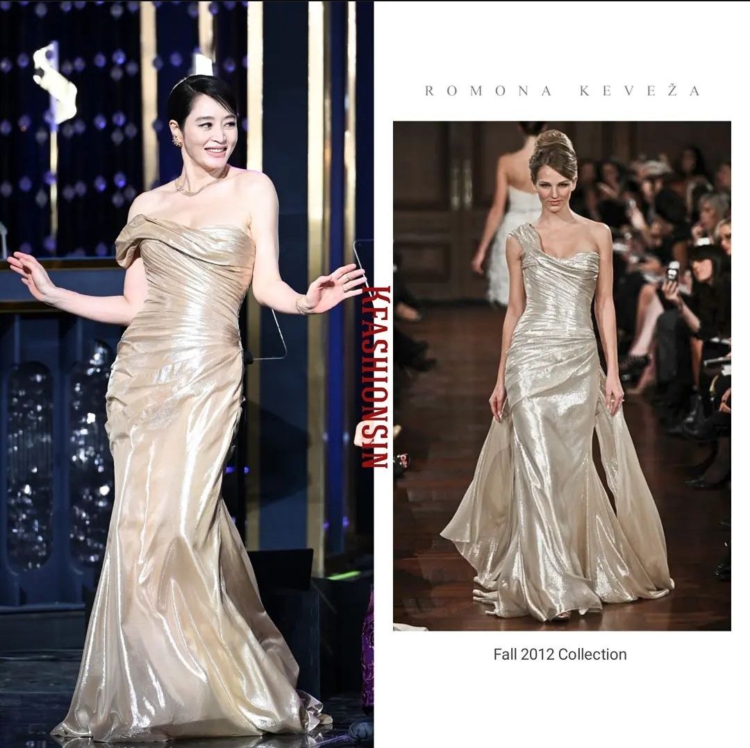 김혜수의 마지막 청룡영화상 시상식 레드카펫 드레스는 트로피를 연상시키는 골드빛 플리츠 드레스였습니다.