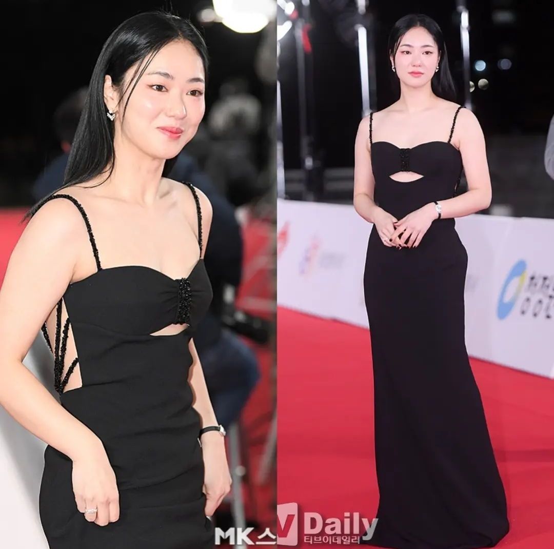 '밀수'로 신인여우상을 수상한 고민시는 누드톤의 드레스를 입었어요.