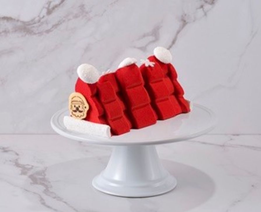 레드 크리스마스 케이크는 계피, 정향 등 다양한 향신료가 어우러진 부드러운 크림, 달콤한 초콜릿 무스, 상큼한 체리 콤포트, 얇고 바삭한 비스킷으로 구성되어 있습니다.