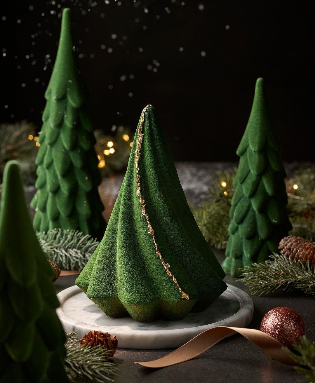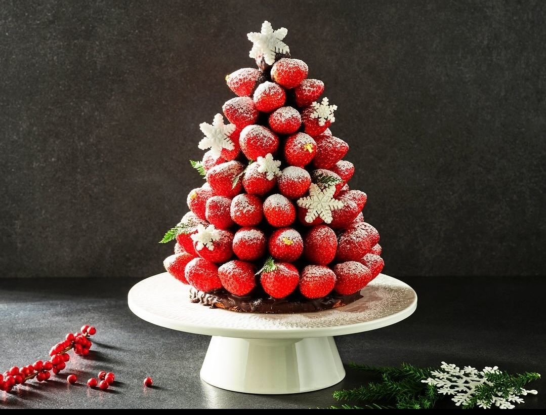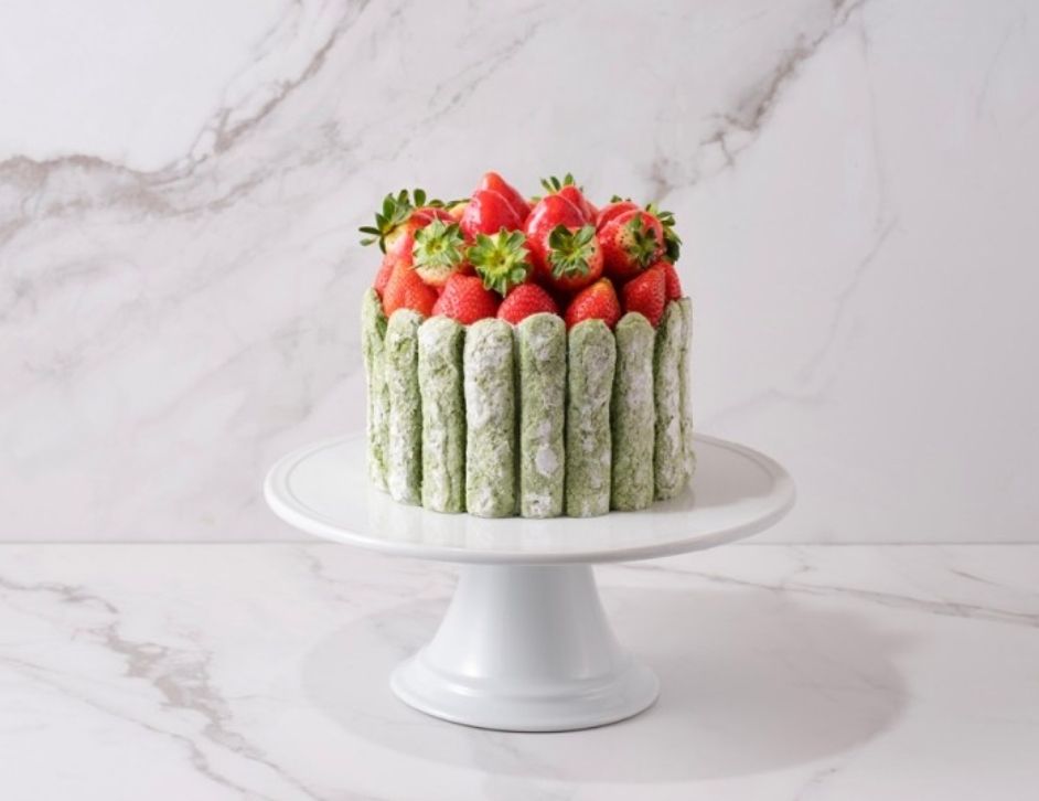 신선한 생딸기와 풍부한 디플로마 크림을 넣고, 고소한 피스타치오 그린 핑거 쿠키로 감싸 크리스마스 트리를 표현한 케이크.