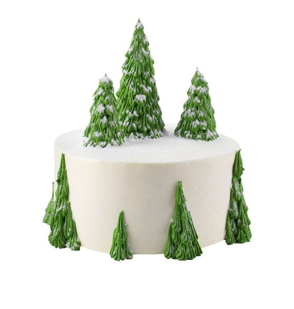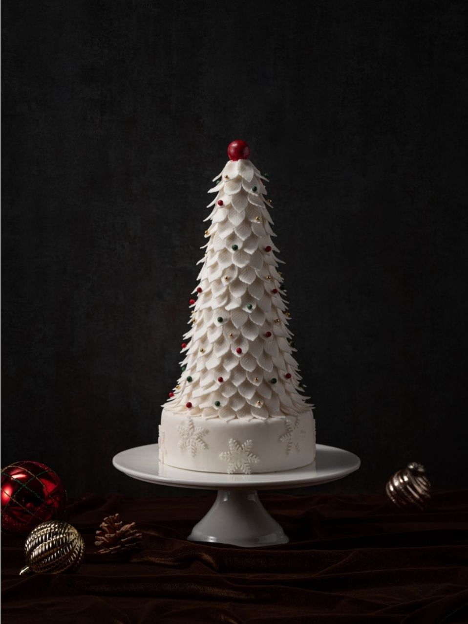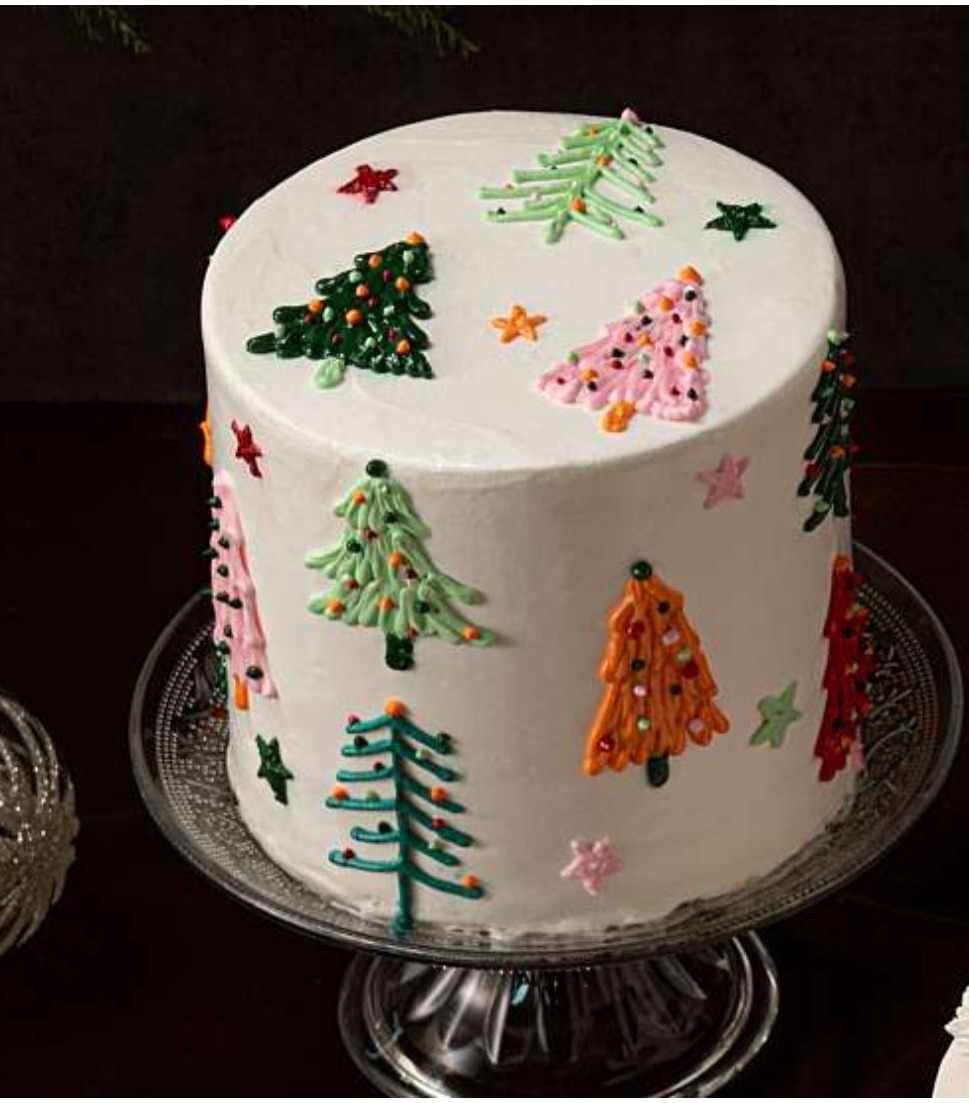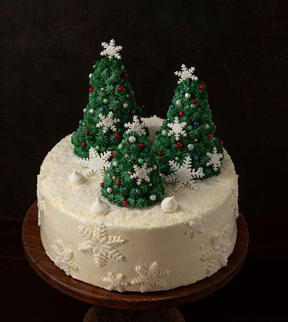 화이트 마스카포네 크림 시트에 달콤한 버터크림을 아이싱하고 화려한 트리 장식이 포인트인 스페셜 케이크.