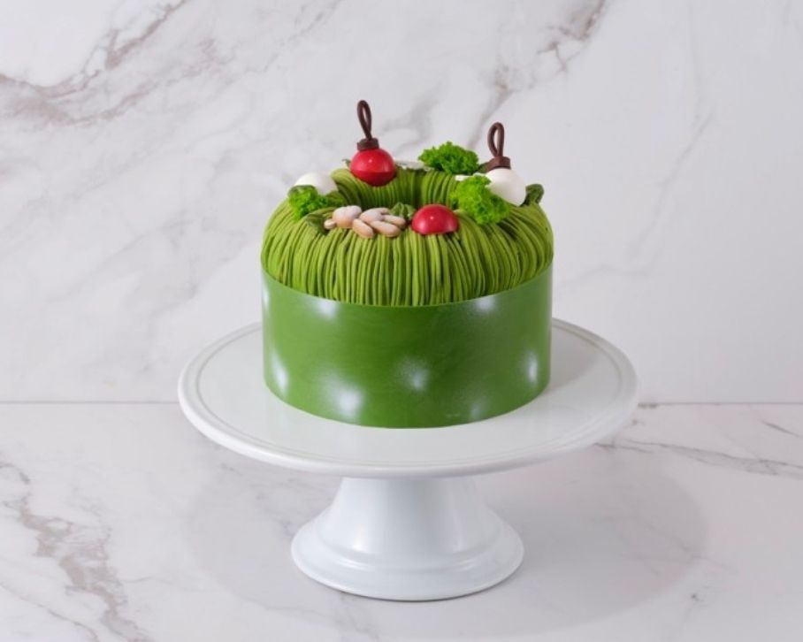 280여 개의 설탕 나뭇잎을 파티셰가 하나하나 손수 붙여 정성을 더하고, 레드벨벳 시트와 녹차 시트를 교차해 쌓아 올린 뒤 화이트 가나슈크림을 더하여 높이만 40cm에 달하는 스페셜 케이크입니다.